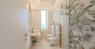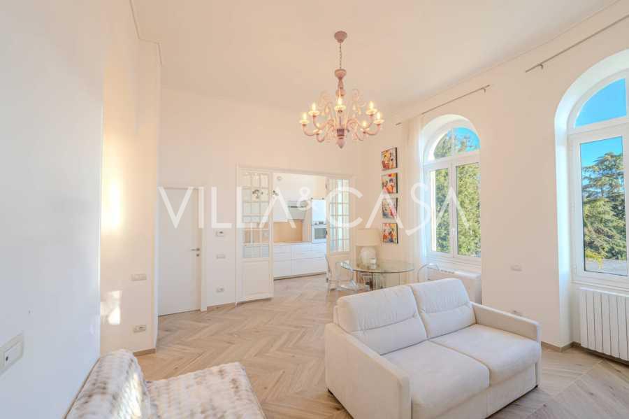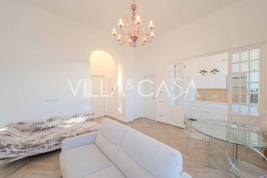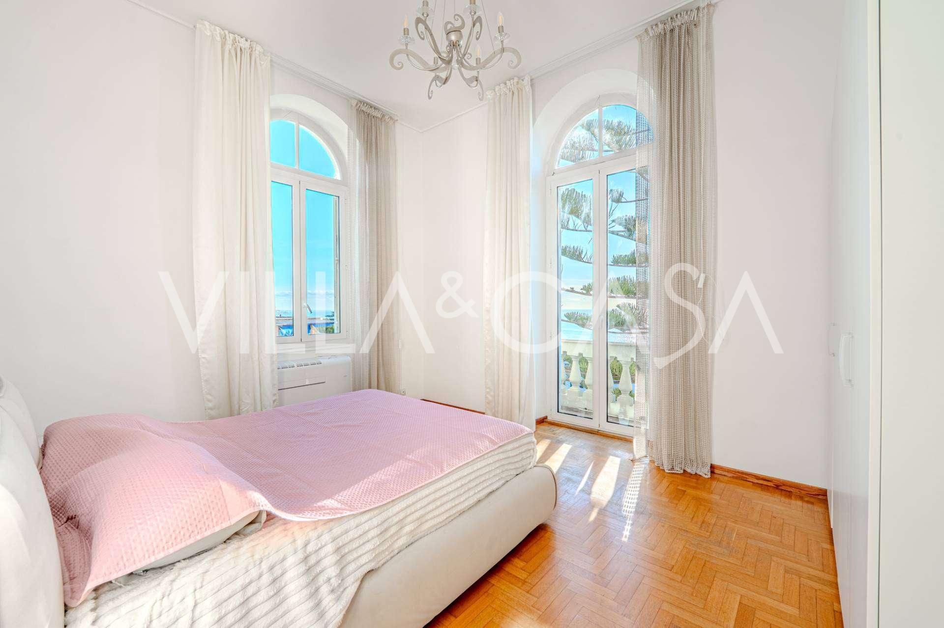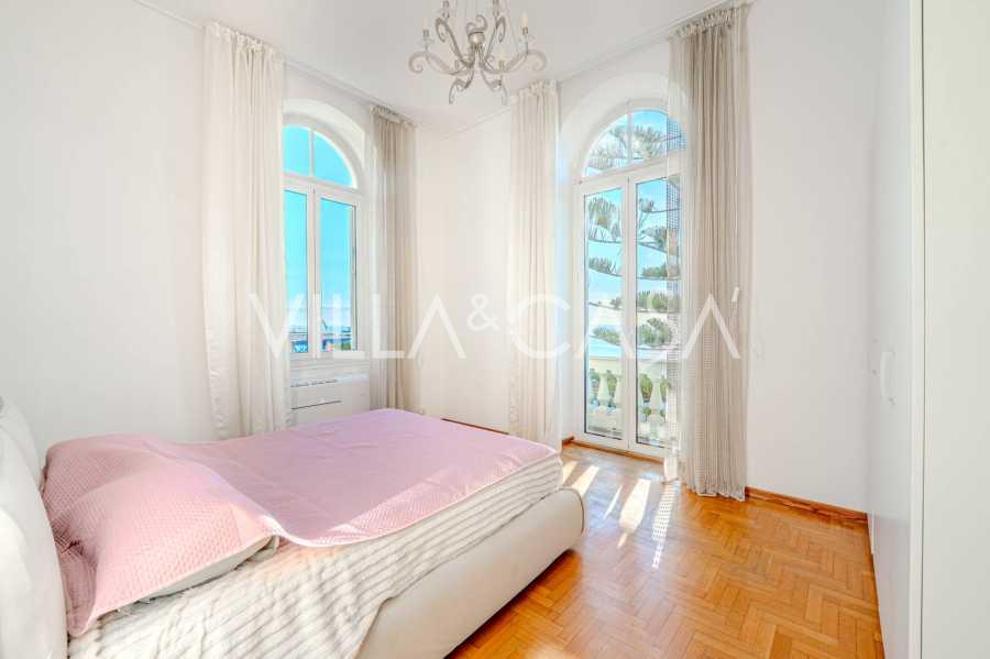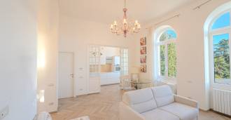 A two-room apartment in Sanremo is available for rent, with an area of 73 m² and a sea view. It is located on the second floor of a building with an elevator and includes a living room, a bedroom with a balcony, a kitchen, and a bathroom. The apartment is in excellent condition, equipped with new windows, air conditioning, parquet floors, and autonomous heating. It is fully furnished. The rental price includes a garage space. The property is situated in a gated residential complex with a swimming pool, garden, recreation area, and barbecue spot. It is only a 7-minute walk to the city center and the sea.
