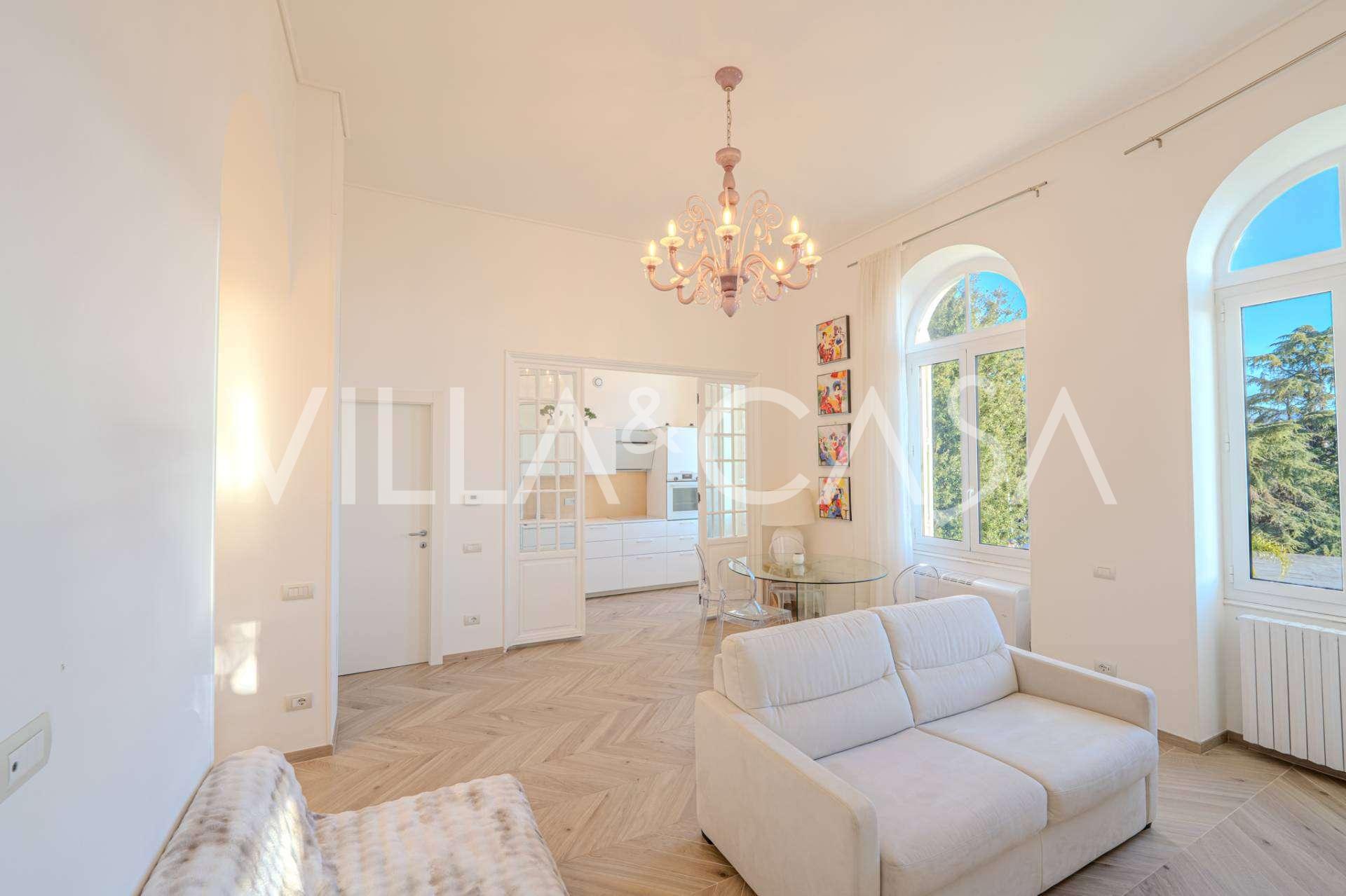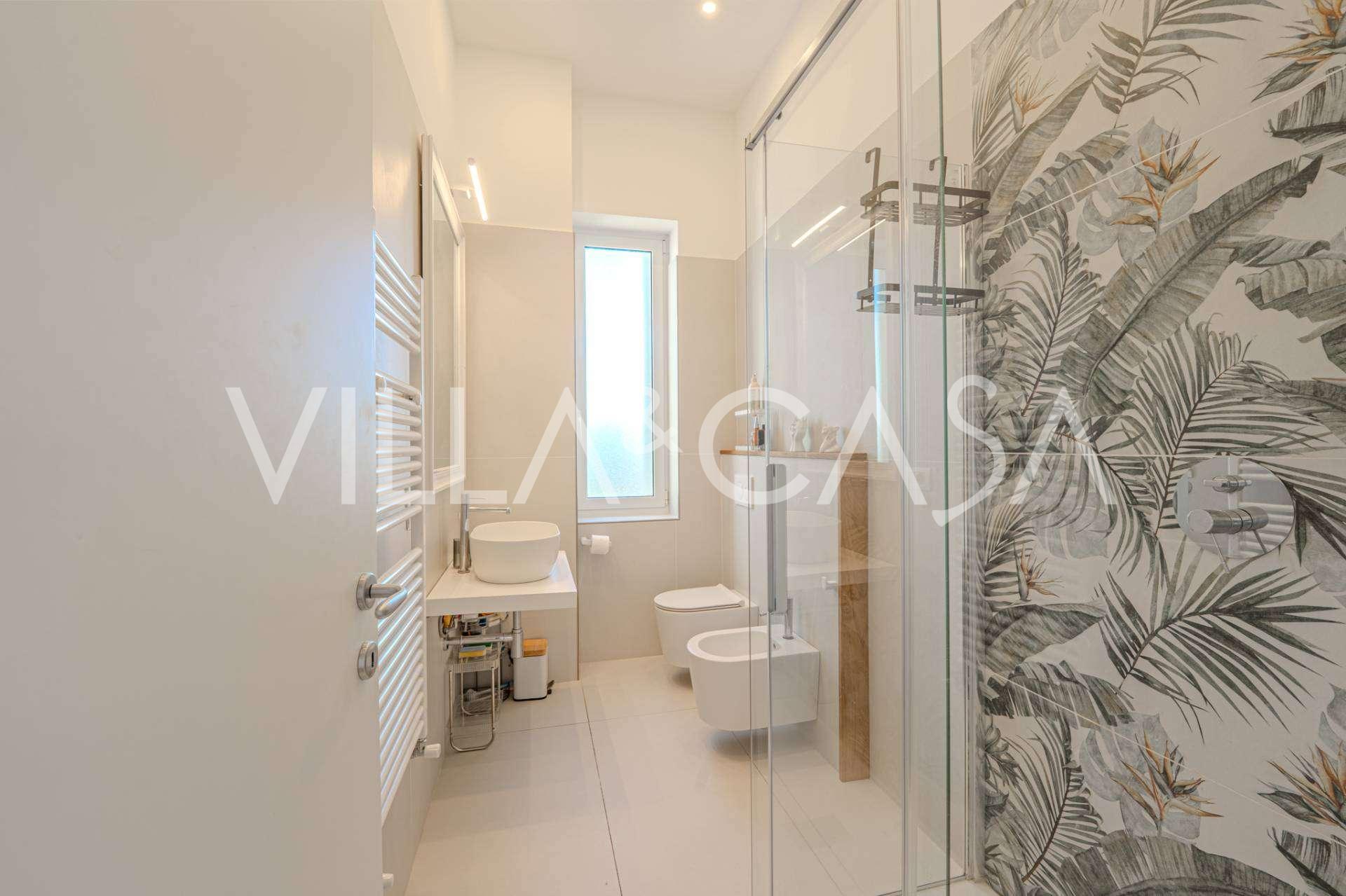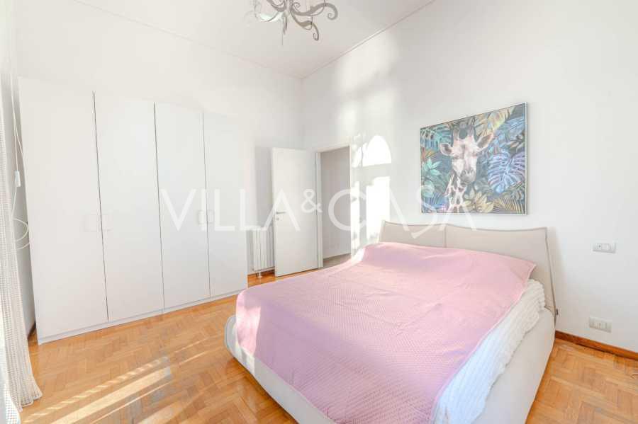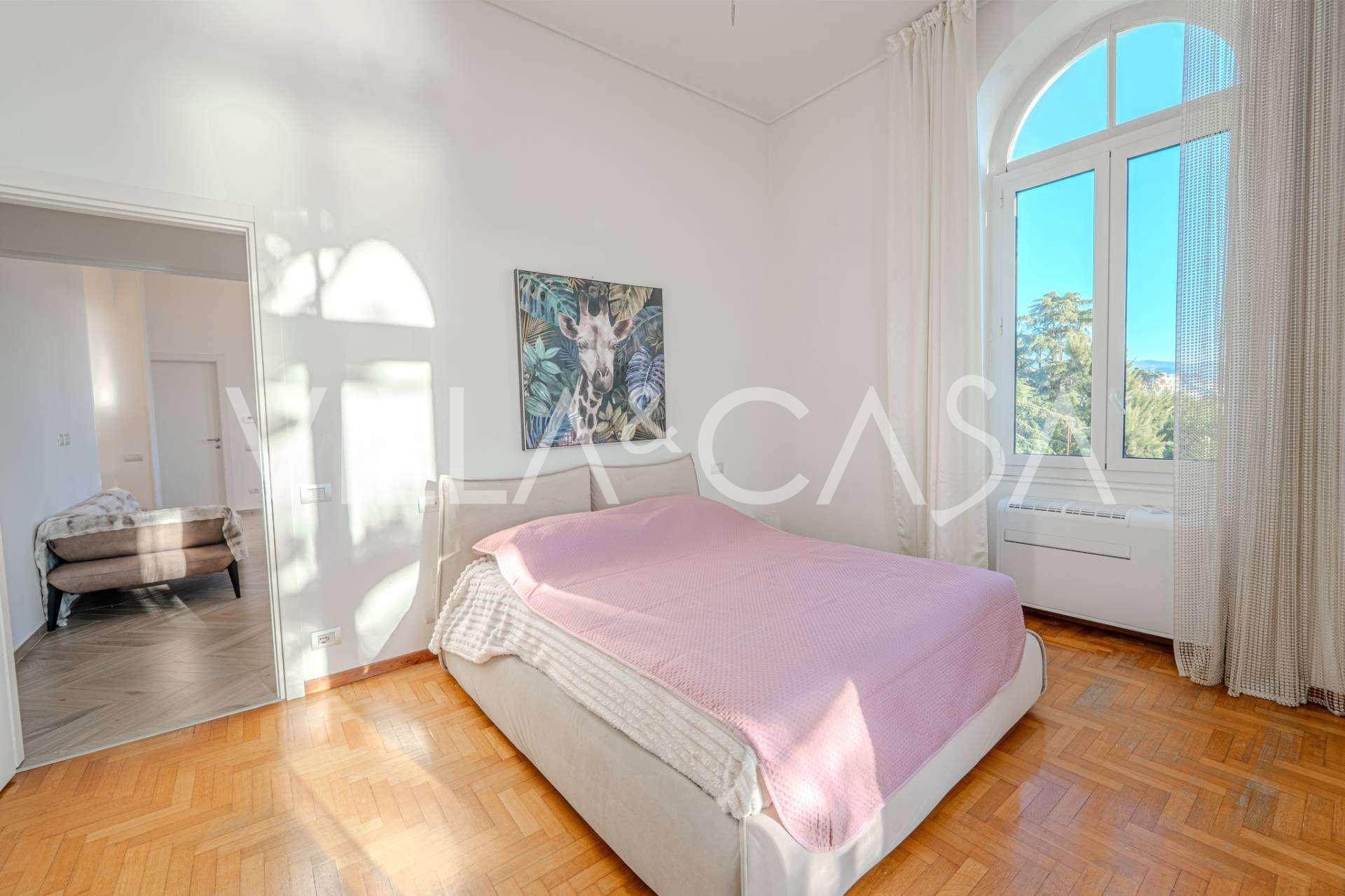 A two-room apartment in Sanremo is available for rent, with an area of 73 m² and a sea view. It is located on the second floor of a building with an elevator and includes a living room, a bedroom with a balcony, a kitchen, and a bathroom. The apartment is in excellent condition, equipped with new windows, air conditioning, parquet floors, and autonomous heating. It is fully furnished. The rental price includes a garage space. The property is situated in a gated residential complex with a swimming pool, garden, recreation area, and barbecue spot. It is only a 7-minute walk to the city center and the sea.