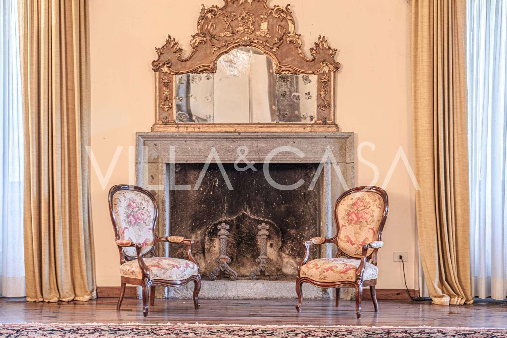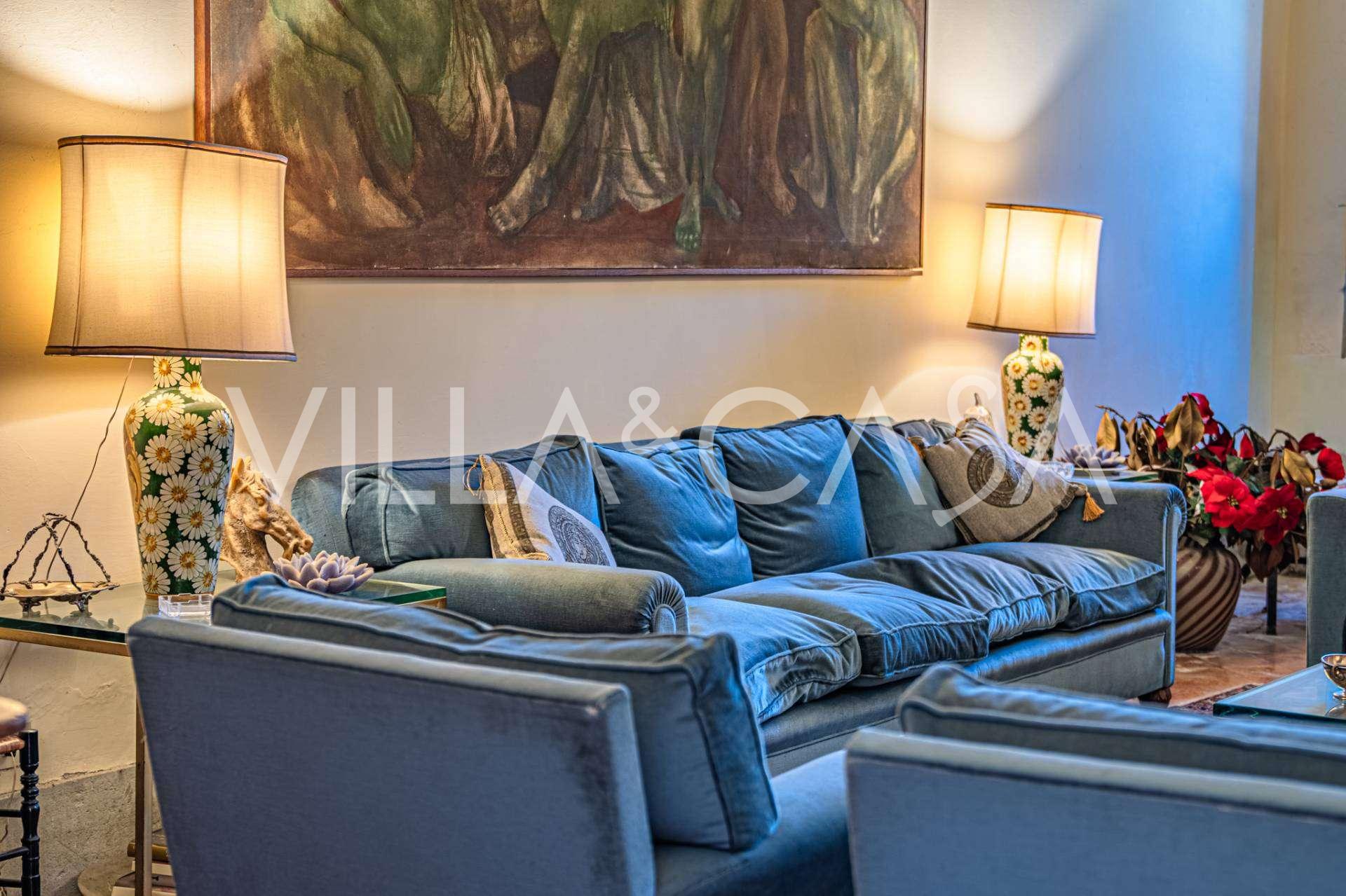 On the first floor, there are spacious reception rooms, an office, a bedroom, three bathrooms, an exquisite dining room, and a large kitchen that extends to the lower level, where a banquet hall is located, ideal for celebrations.