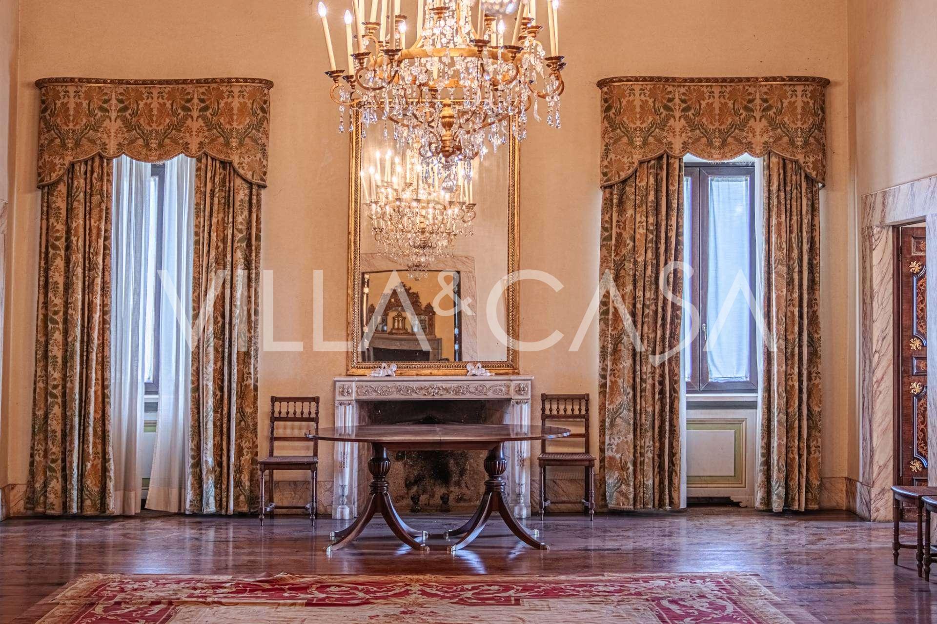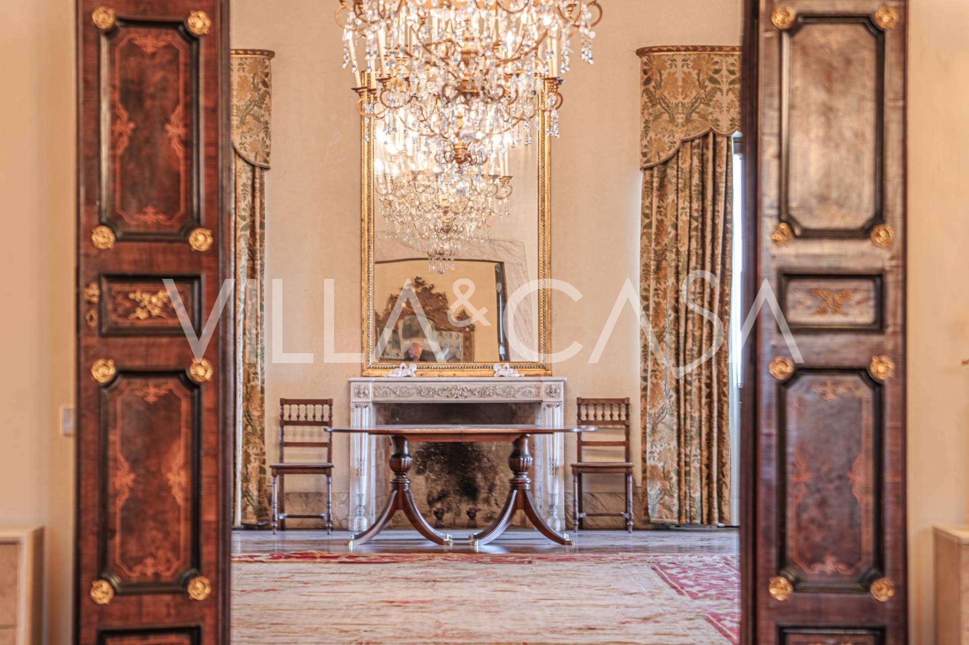 The second floor houses two grand salons with painted ceilings, two bedrooms, and two bathrooms.