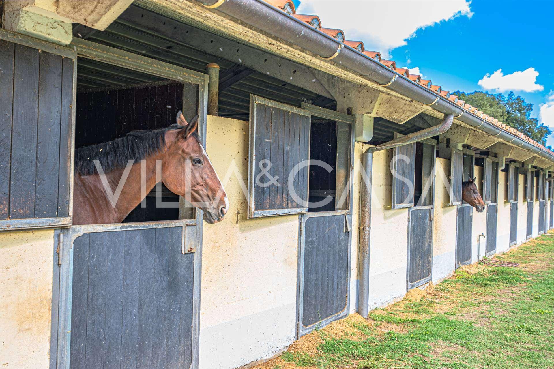 Located just twenty kilometers north of Rome, the castle is surrounded by thirty hectares of green meadows and ancient forests, creating an atmosphere of complete seclusion and harmony with nature. This is where the famous racehorse Ribot was born. The equestrian facilities meet the highest international standards: two stables with twenty-three and twenty-five stalls — featuring tack rooms, horse care areas, and cozy staff apartments. The complex also includes an indoor riding arena, a covered carousel, and spacious pastures suitable for training and competitions. The castle neighbors one of Europe's most prestigious golf clubs and has its own helipad. Ancient Etruscan caves on the estate add a special charm and historical significance to the place.