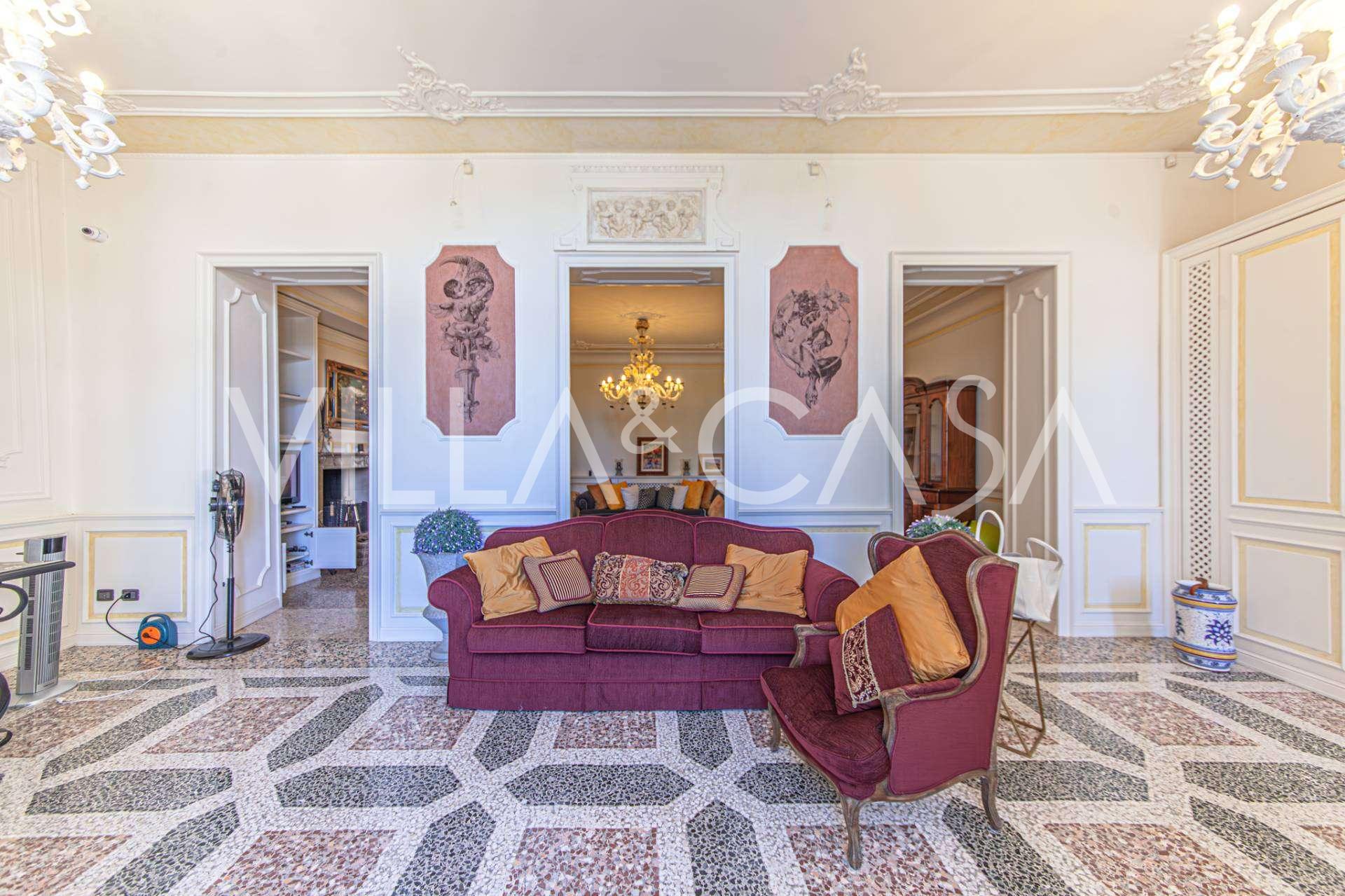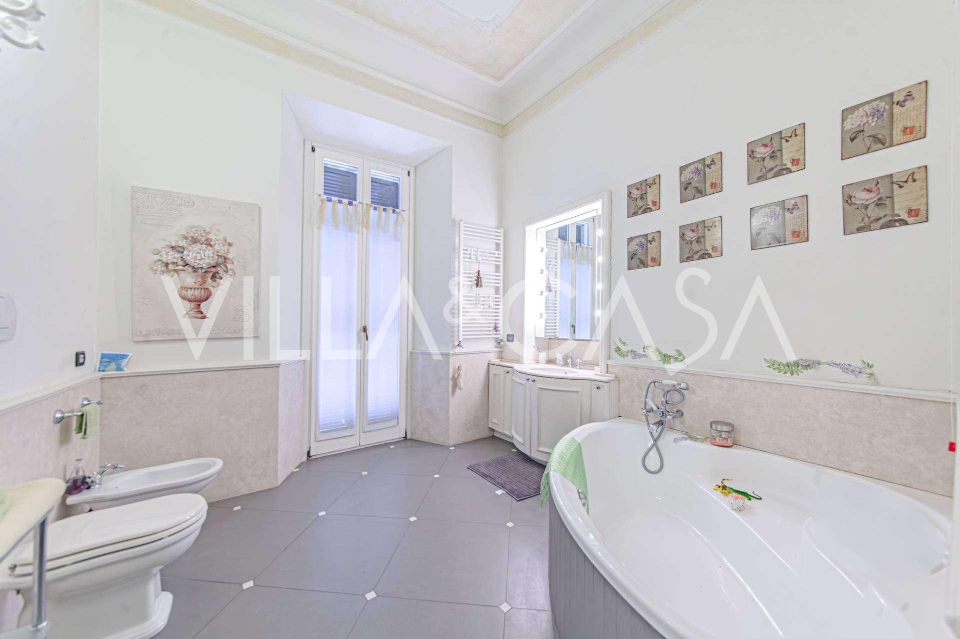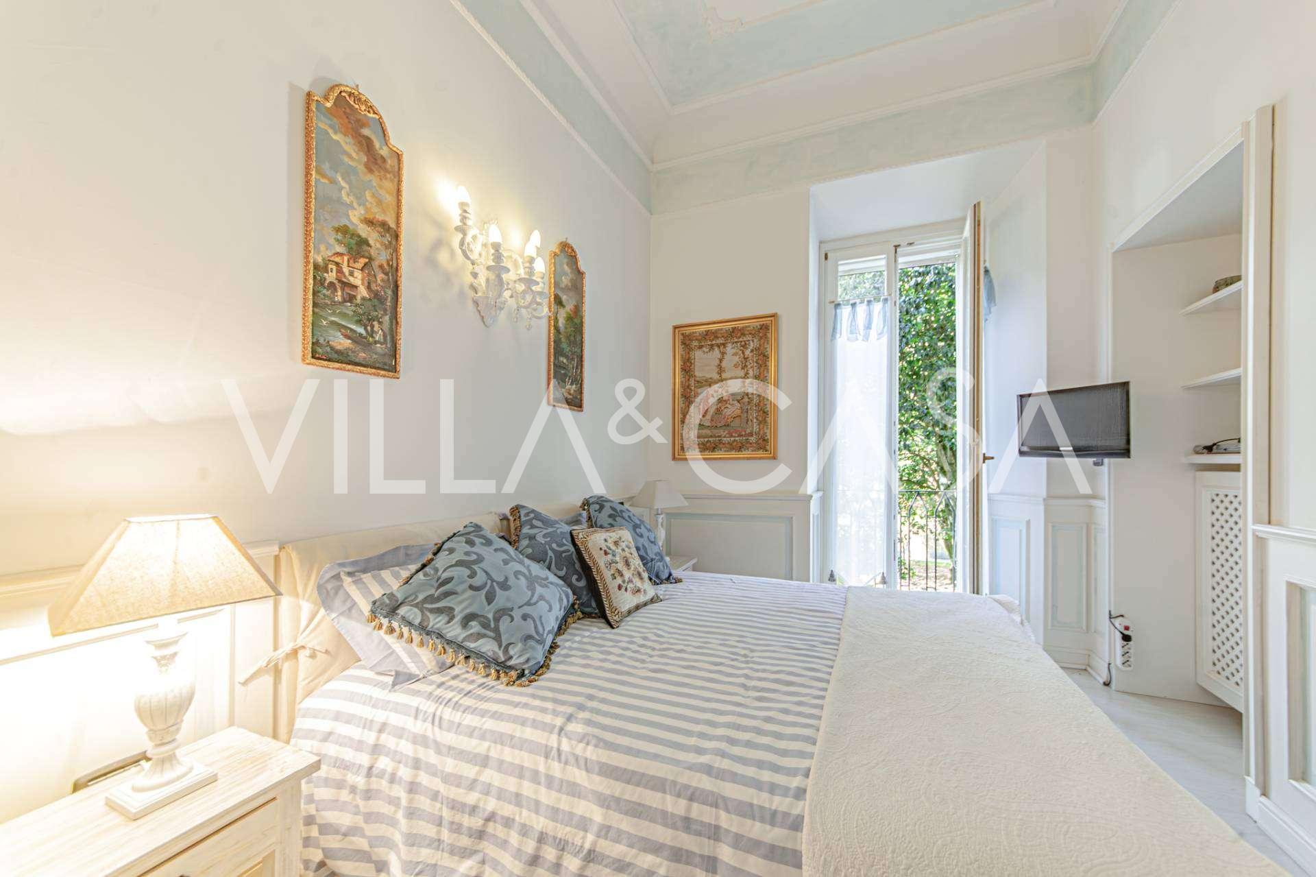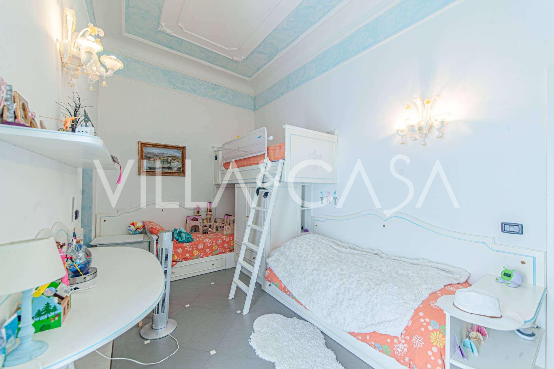 The apartments, covering more than 270 m², are located on the first floor and are accessible via a historic grand staircase with frescoes and pink granite columns from Baveno. The spacious layout includes a magnificent marble reception room with panoramic lake views, a luxurious lounge with a fireplace and stucco, a kitchen with a dining area, a guest toilet, an elegant bathroom, a guest bedroom, a children's room with a walk-in closet, and a master bedroom with its own bathroom.