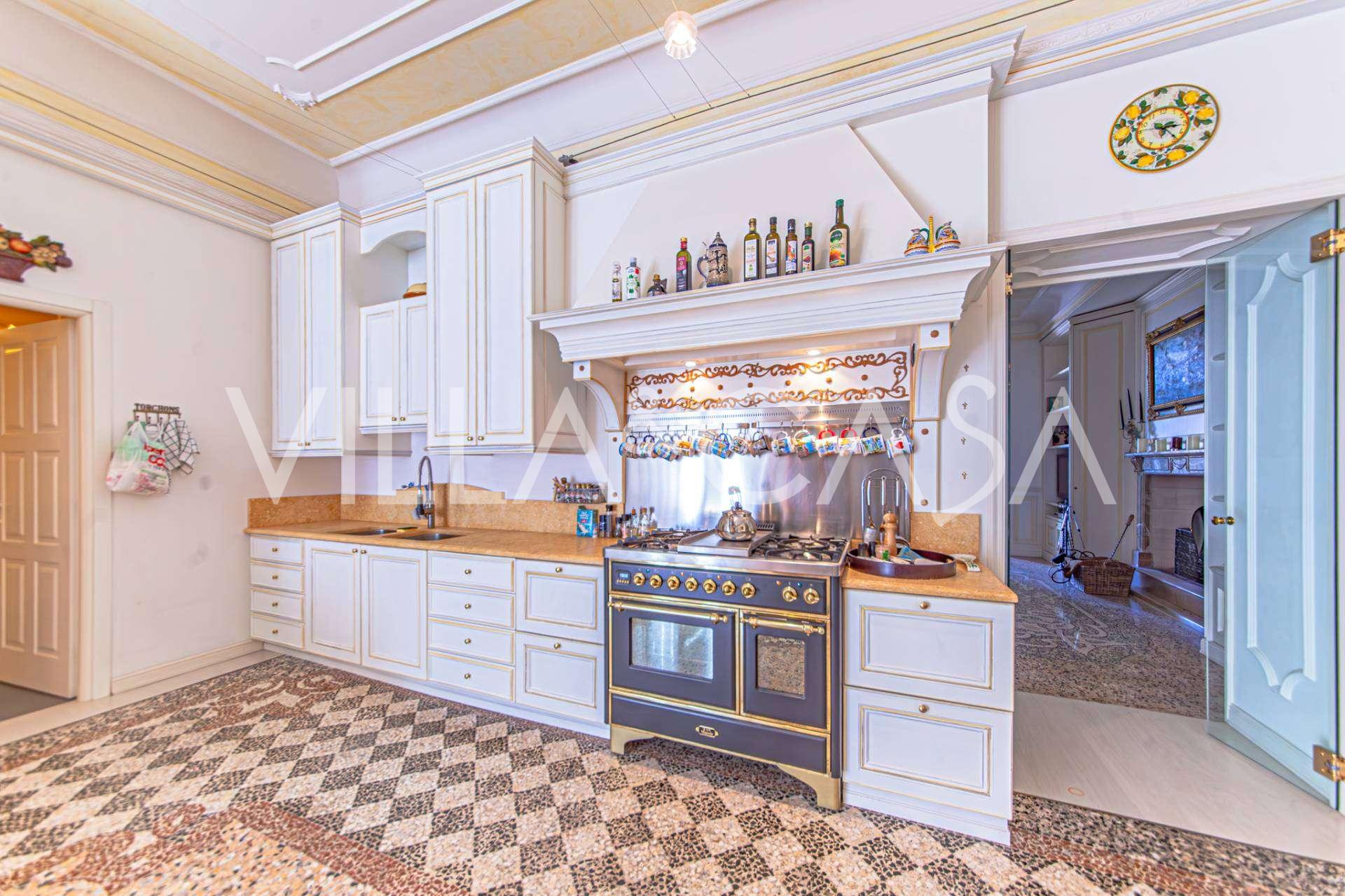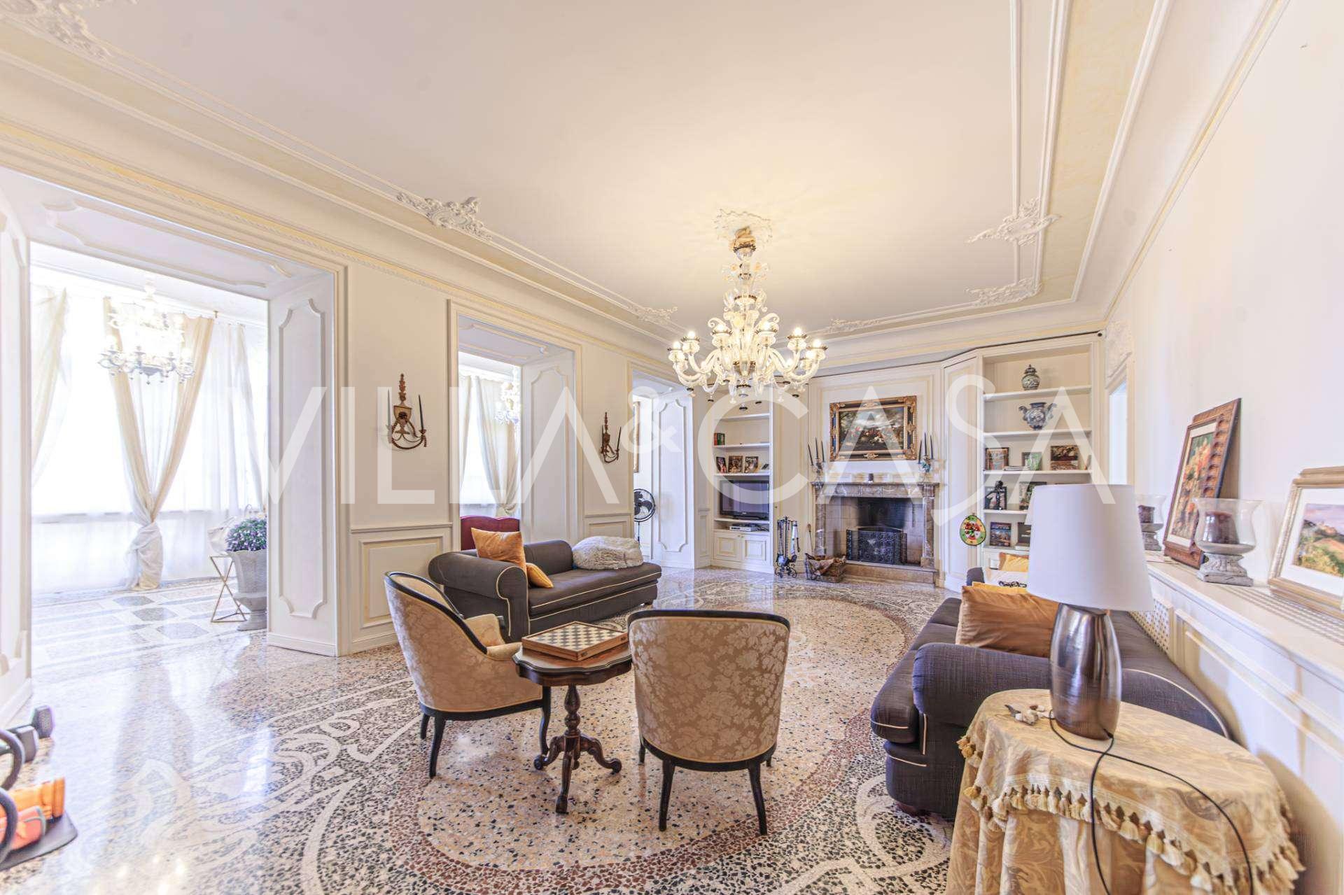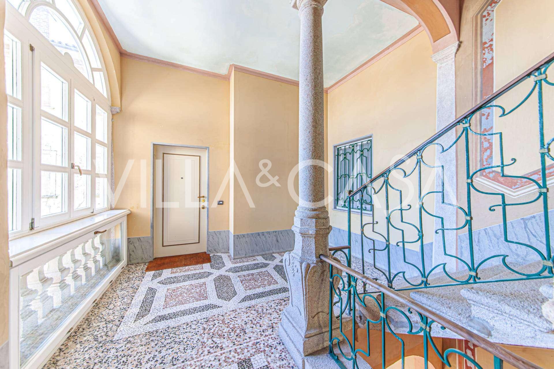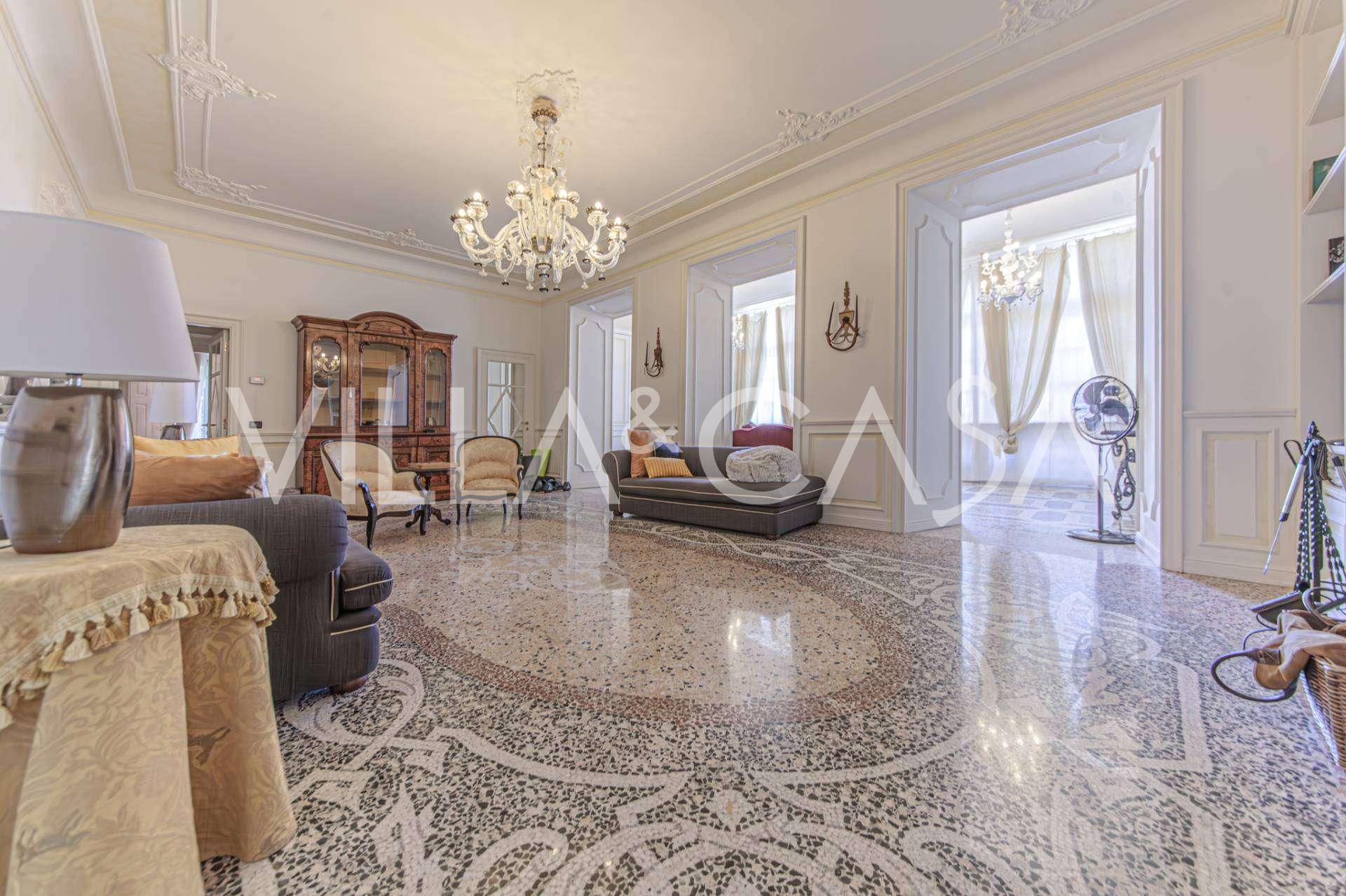 The apartments, covering more than 270 m², are located on the first floor and are accessible via a historic grand staircase with frescoes and pink granite columns from Baveno. The spacious layout includes a magnificent marble reception room with panoramic lake views, a luxurious lounge with a fireplace and stucco, a kitchen with a dining area, a guest toilet, an elegant bathroom, a guest bedroom, a children's room with a walk-in closet, and a master bedroom with its own bathroom.