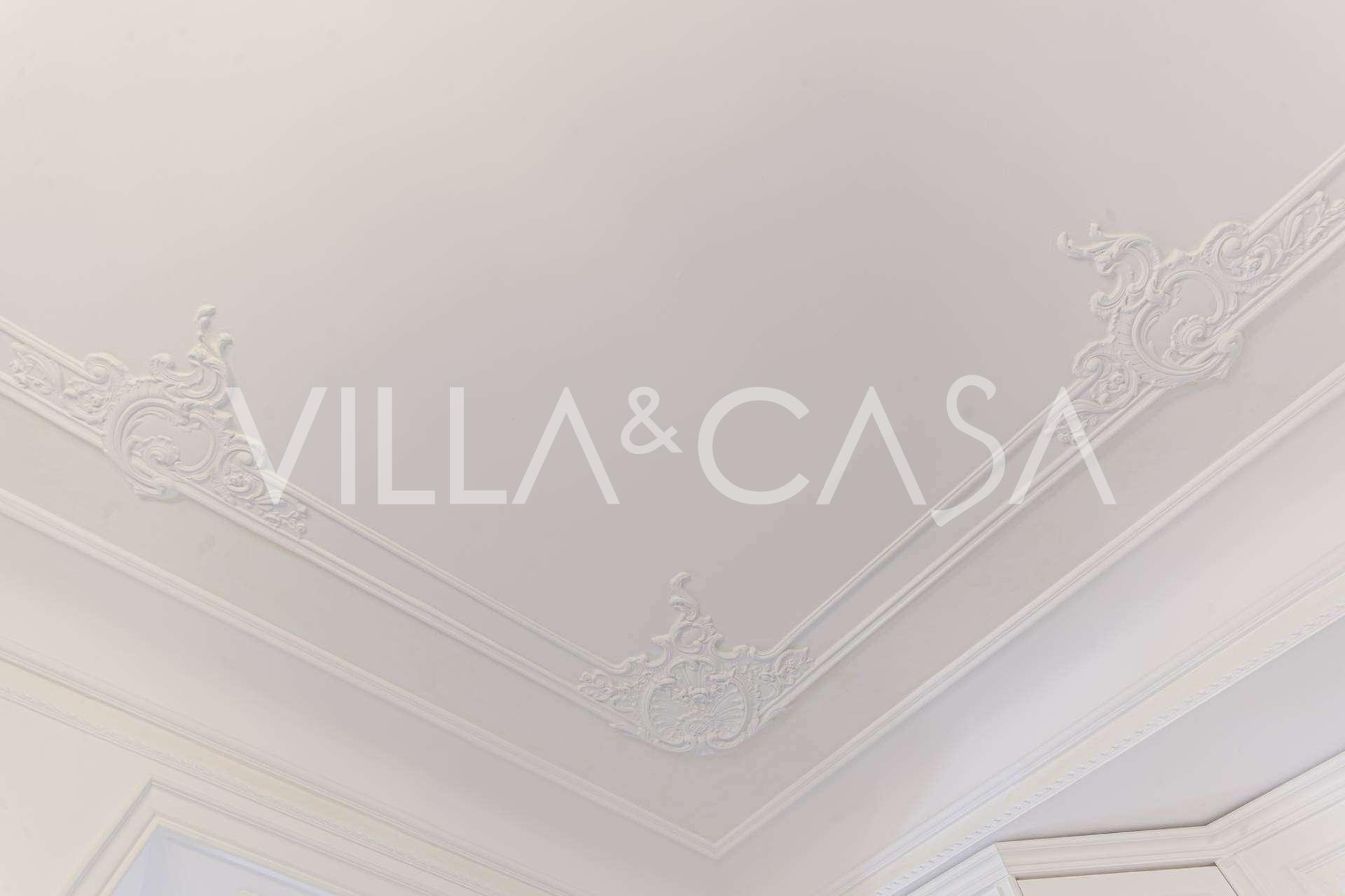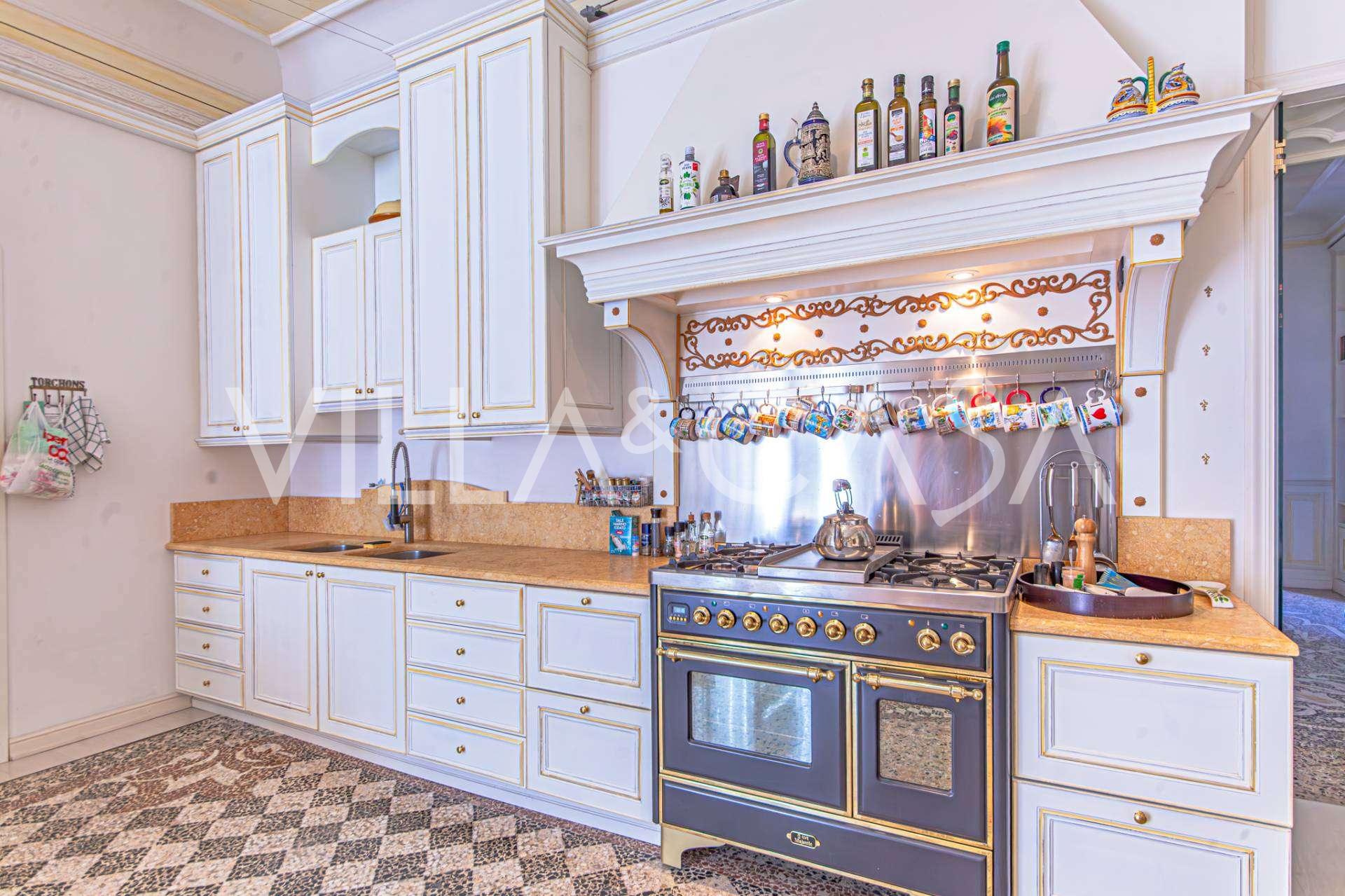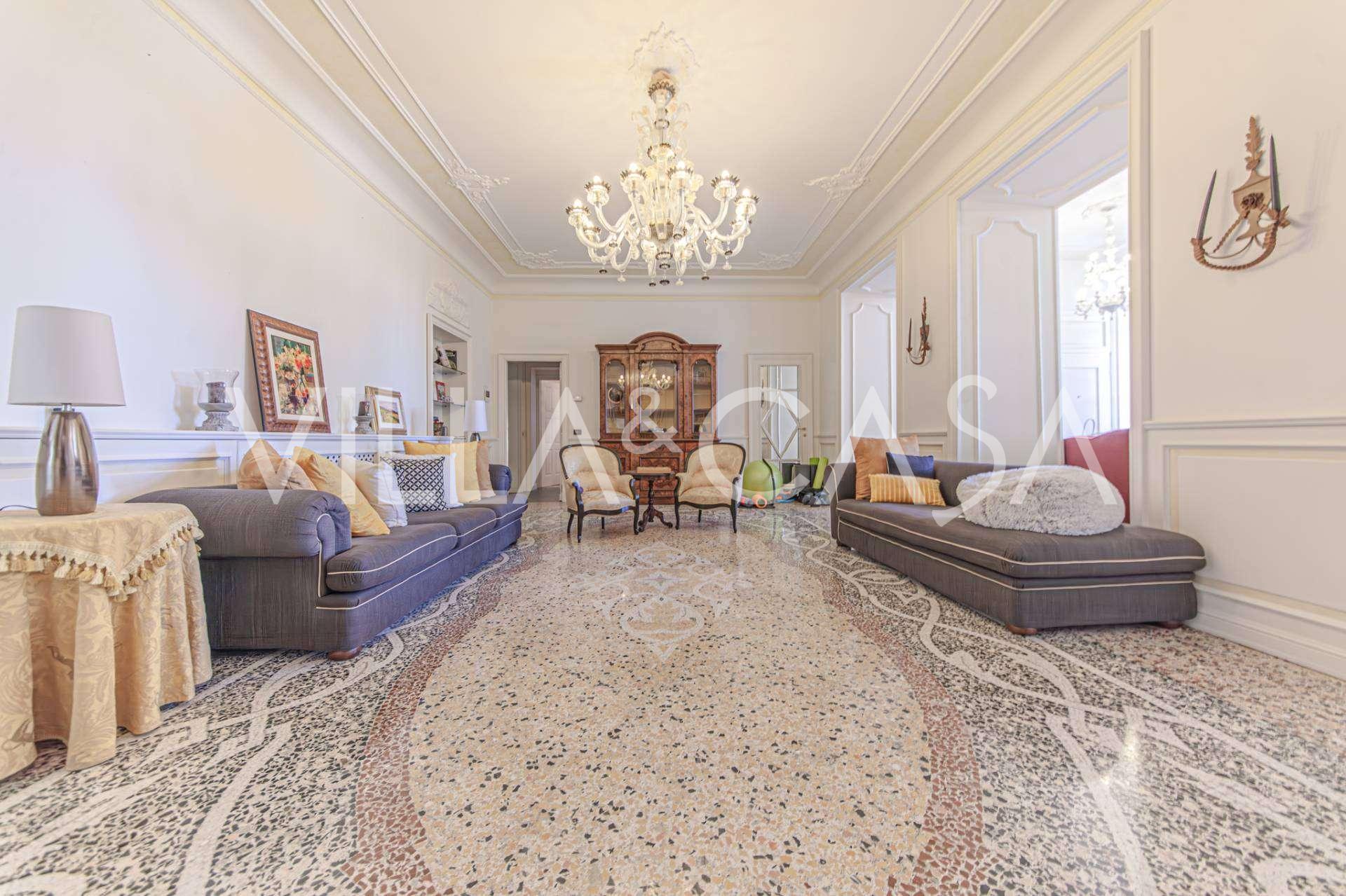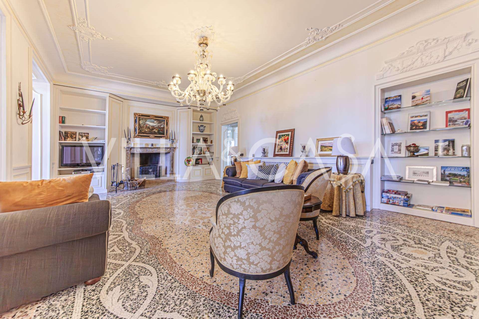 The apartments, covering more than 270 m², are located on the first floor and are accessible via a historic grand staircase with frescoes and pink granite columns from Baveno. The spacious layout includes a magnificent marble reception room with panoramic lake views, a luxurious lounge with a fireplace and stucco, a kitchen with a dining area, a guest toilet, an elegant bathroom, a guest bedroom, a children's room with a walk-in closet, and a master bedroom with its own bathroom.