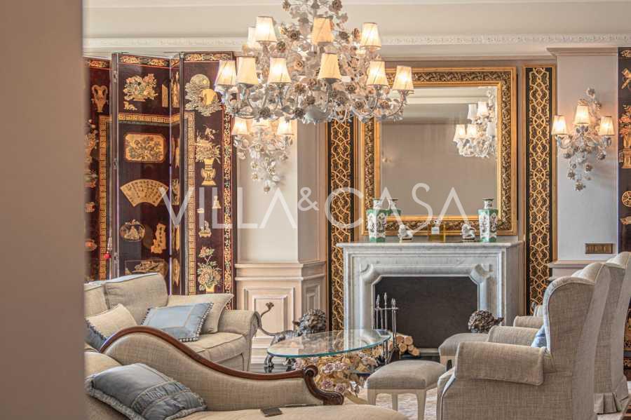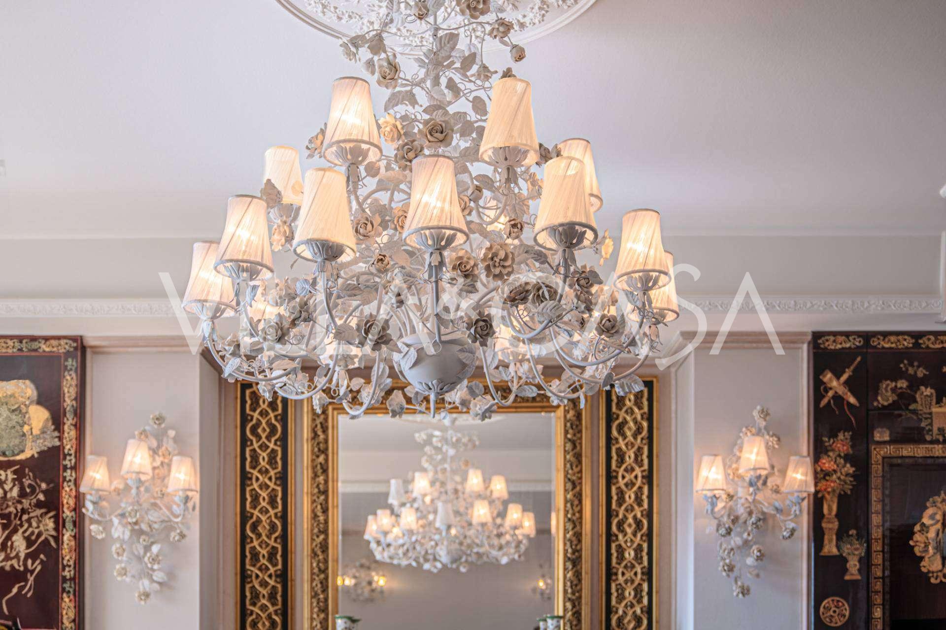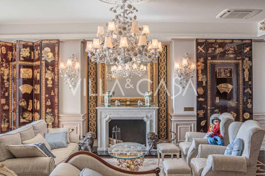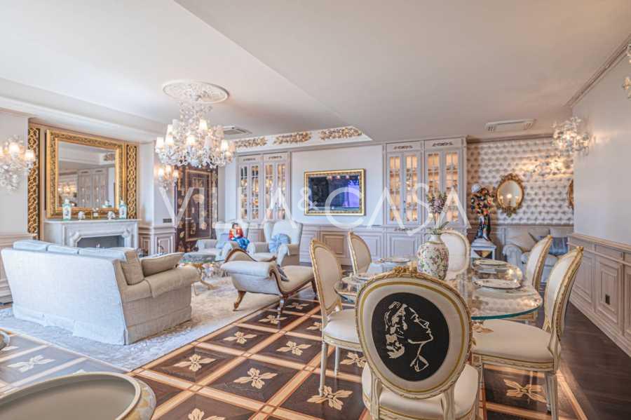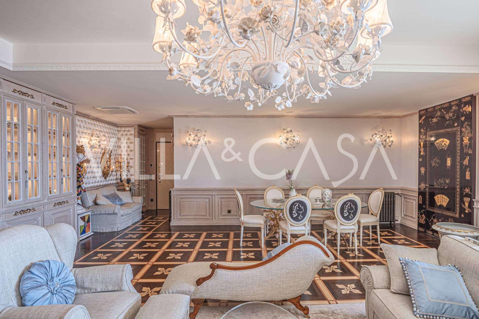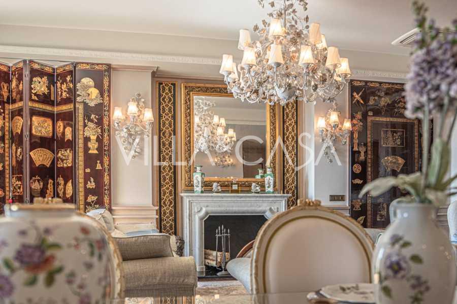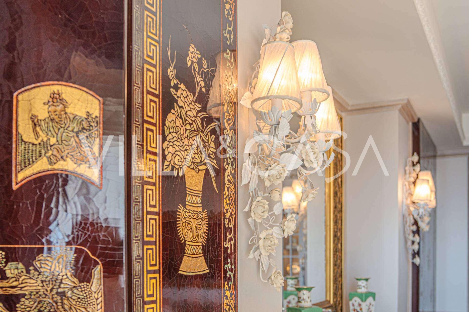 The finishes are executed with exceptional attention to detail: inlaid parquet in the living room, warm parquet boards in the bedrooms, prestigious ceramics in the bathrooms, lacquered wooden shutters and double-glazed windows, Villari brand chandeliers and lighting fixtures, Franco Martinello brand wardrobes, doors from an art workshop in Paris, silk wallpapers, and silk carpets in the living room and bedroom ensuring silence and comfort. Modern heating and air conditioning systems guarantee comfort at any time of the year.