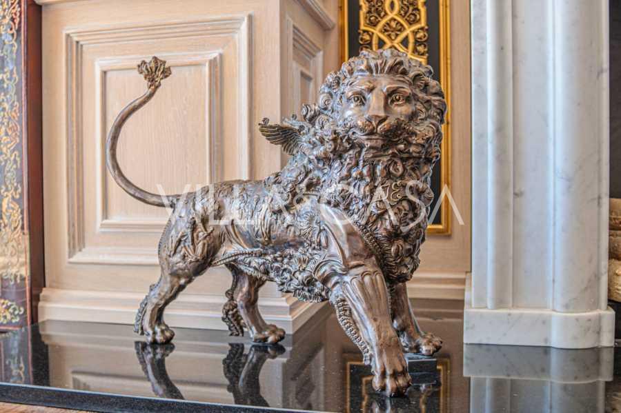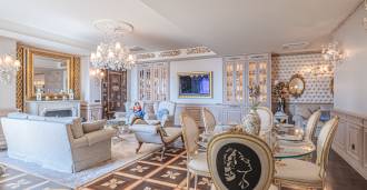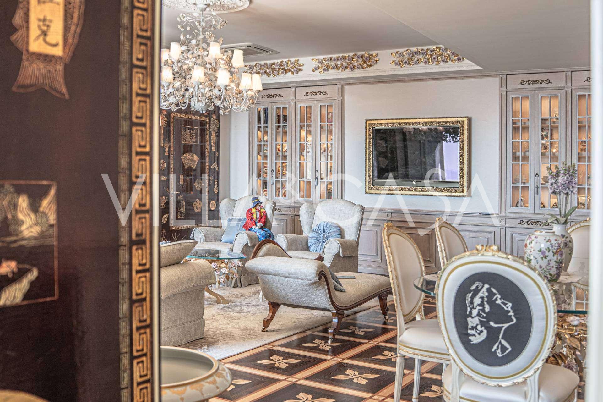 The residence is surrounded by an ancient private park, immersed in greenery and tranquility. Residents are provided with concierge services, a spacious indoor pool with a hydro massage area, elegant changing rooms, and lounge areas that seamlessly blend with the park. The historical luxury of the building is preserved in the decoration of the public areas: a three-flight marble staircase, noble Carrara marble, Burmese parquet, and exquisite Valencian ceramics emphasize the atmosphere of genuine exclusivity.
