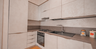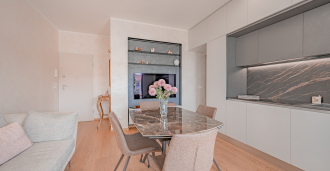 The apartment is located on the fourth and fifth floors of a stylish building with an elevator and includes: two elegant living rooms, two modern kitchens, three large bedrooms, two stylish bathrooms, a separate guest toilet, storage rooms, and a spacious walk-in closet.