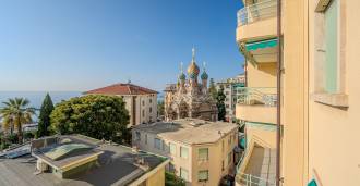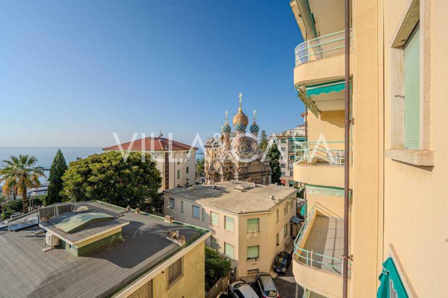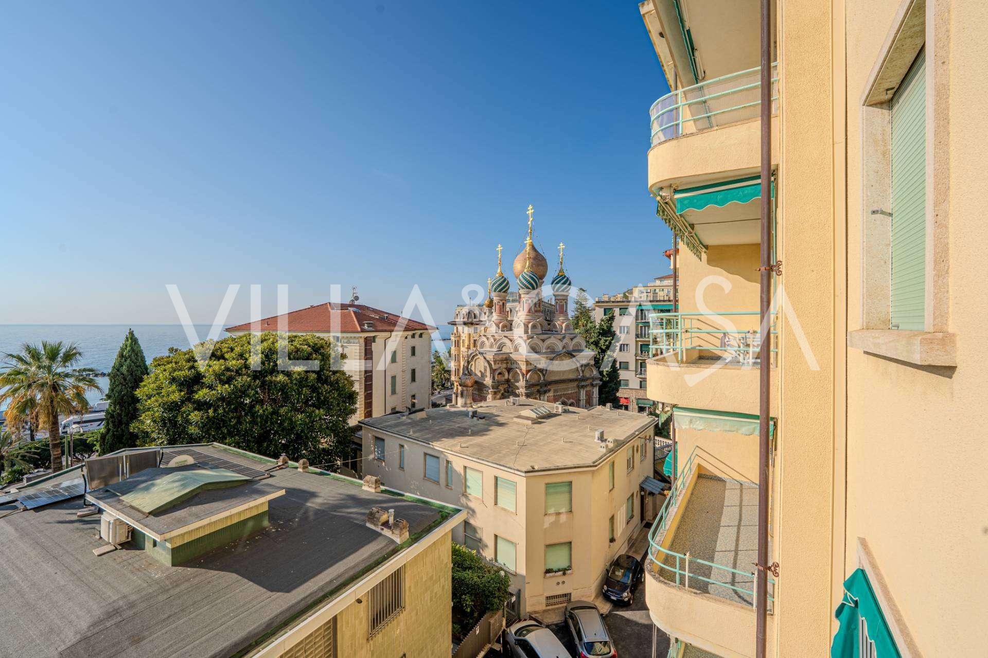 This spacious four-room apartment is located in the center of Sanremo, opposite the beautiful Russian church, within a prestigious residential complex with well-maintained grounds. The apartment covers 104 m² and is situated on the fourth floor, offering views of the sea and the unique architecture of the Russian church.