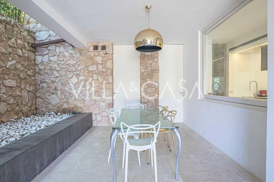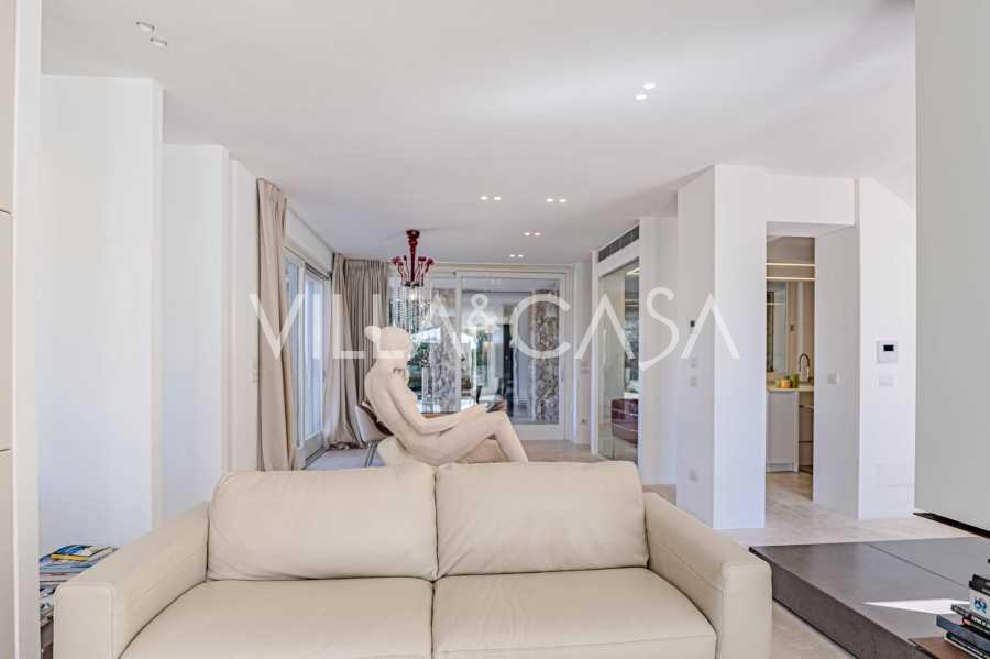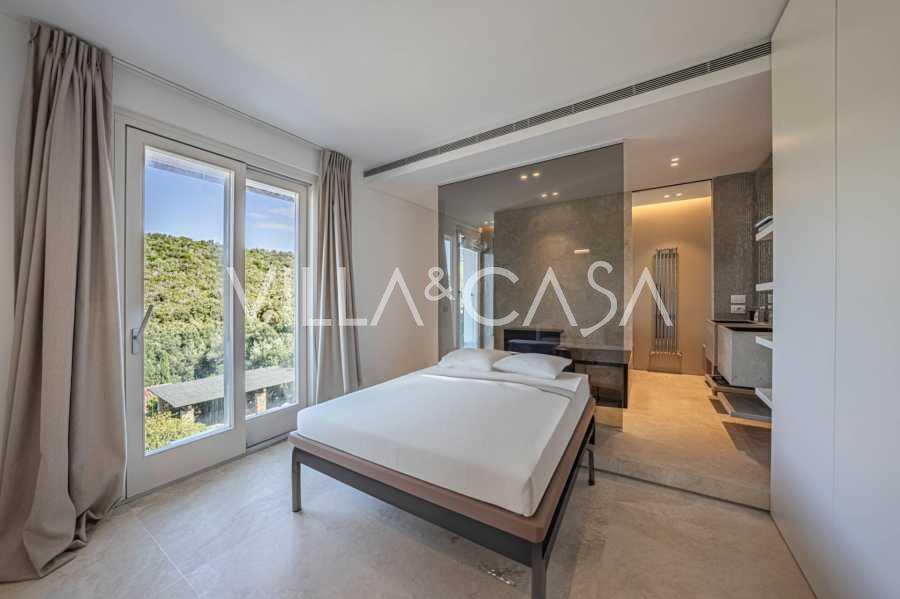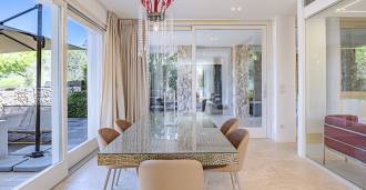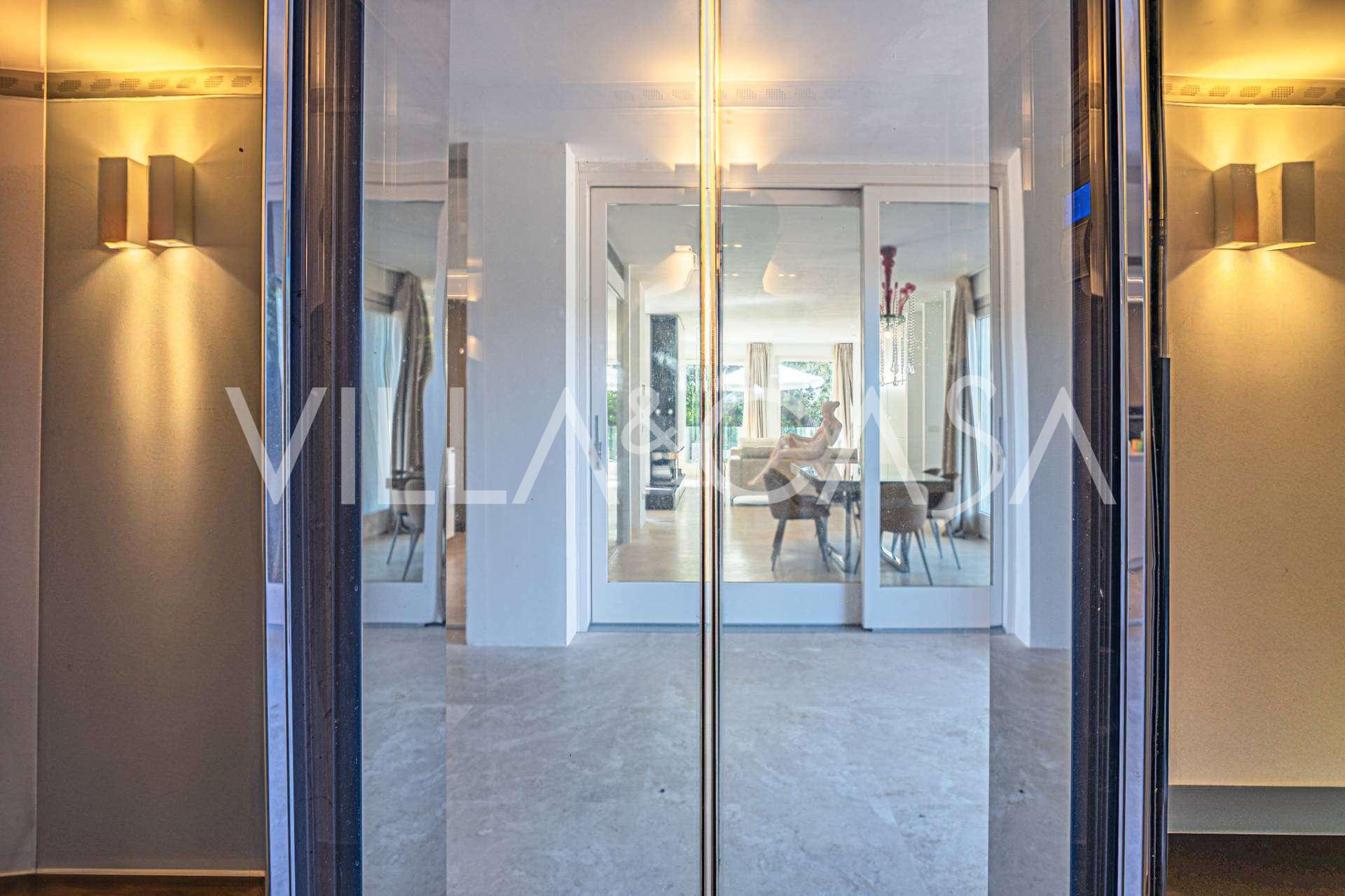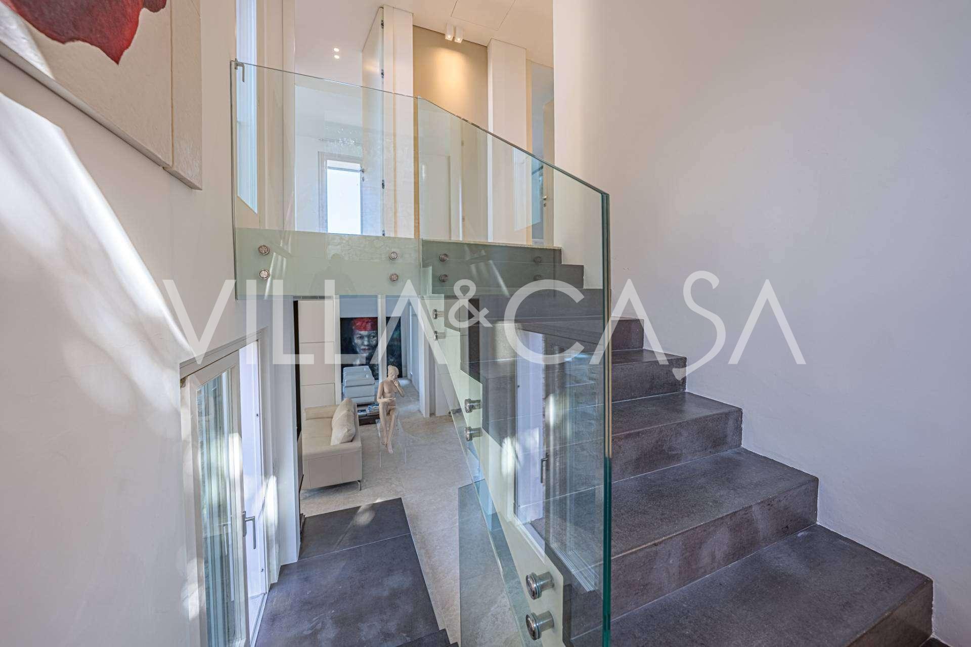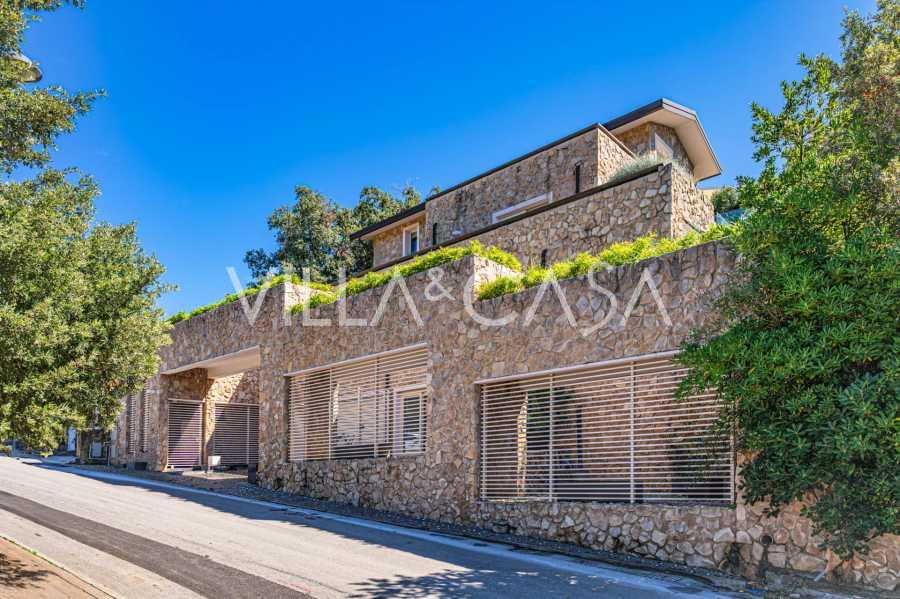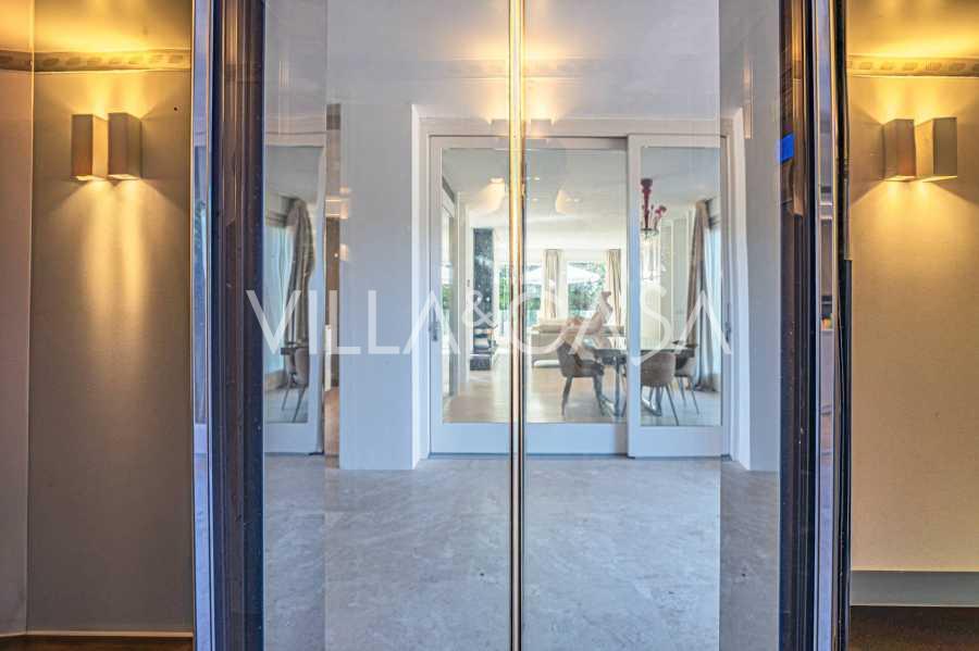 Recently fully renovated and spread over four levels connected by an internal elevator, the residence showcases rare elegance and refined functionality. The architecture, with its impeccable lines and glass facades, creates harmony between the interior spaces and charming terraces. The villa is surrounded by a well-maintained terraced garden of 500 m², offering owners privacy and tranquility, where a sophisticated relaxation area with a swimming pool is also hidden.