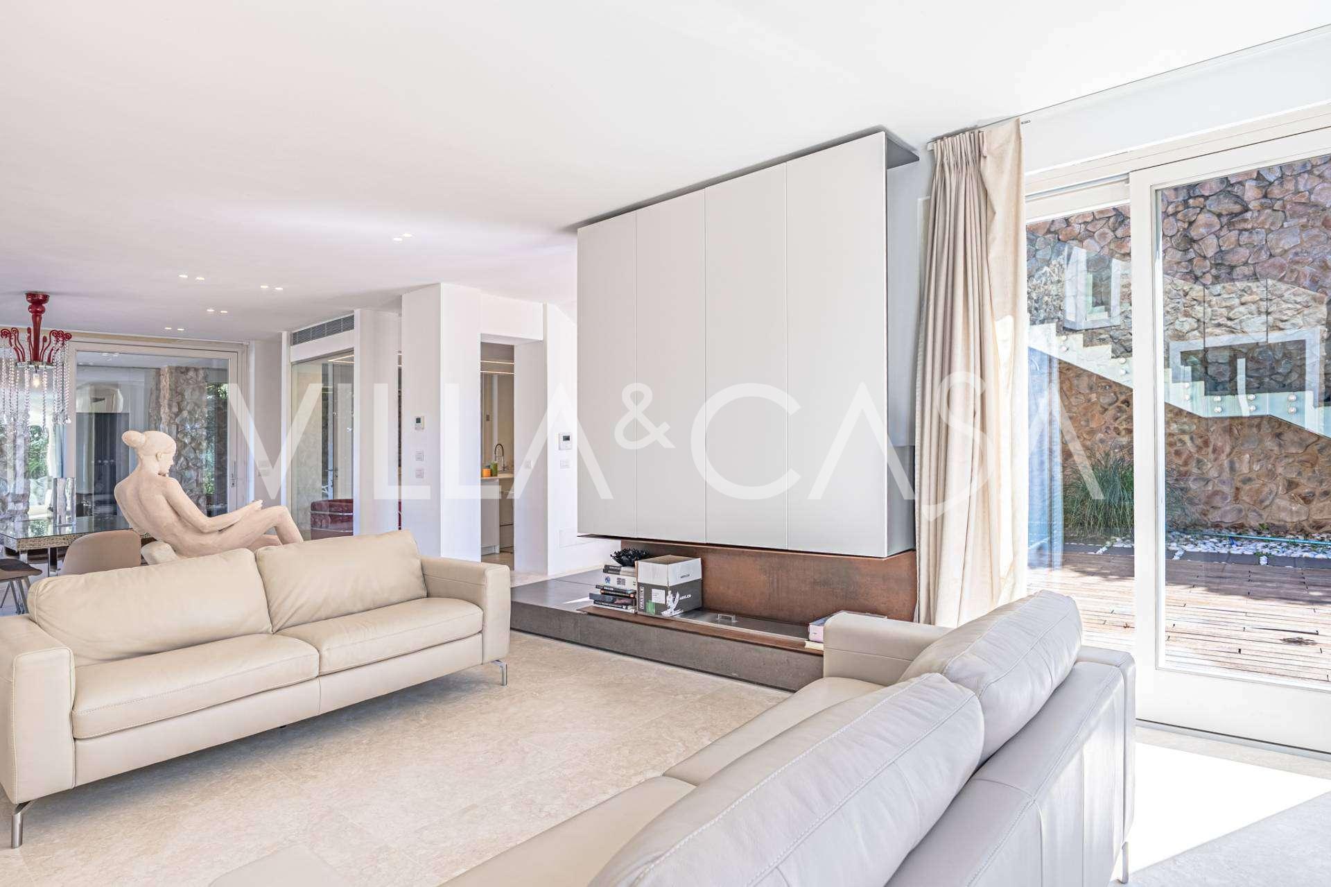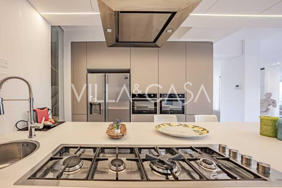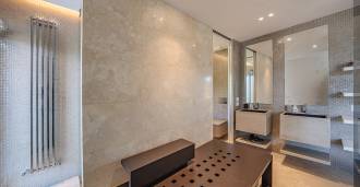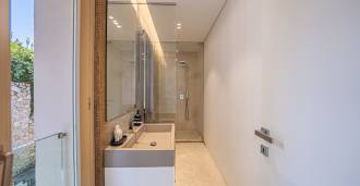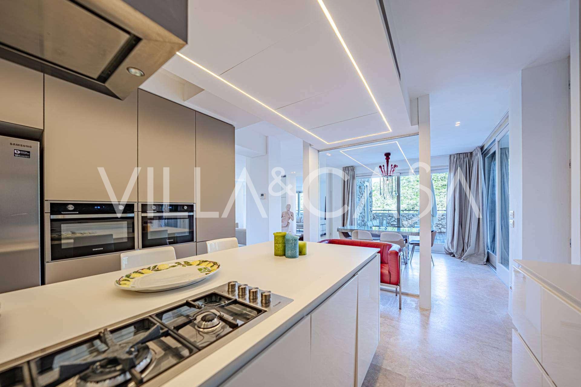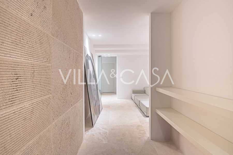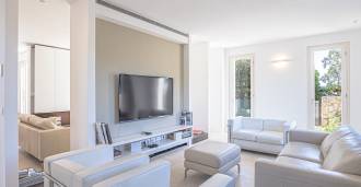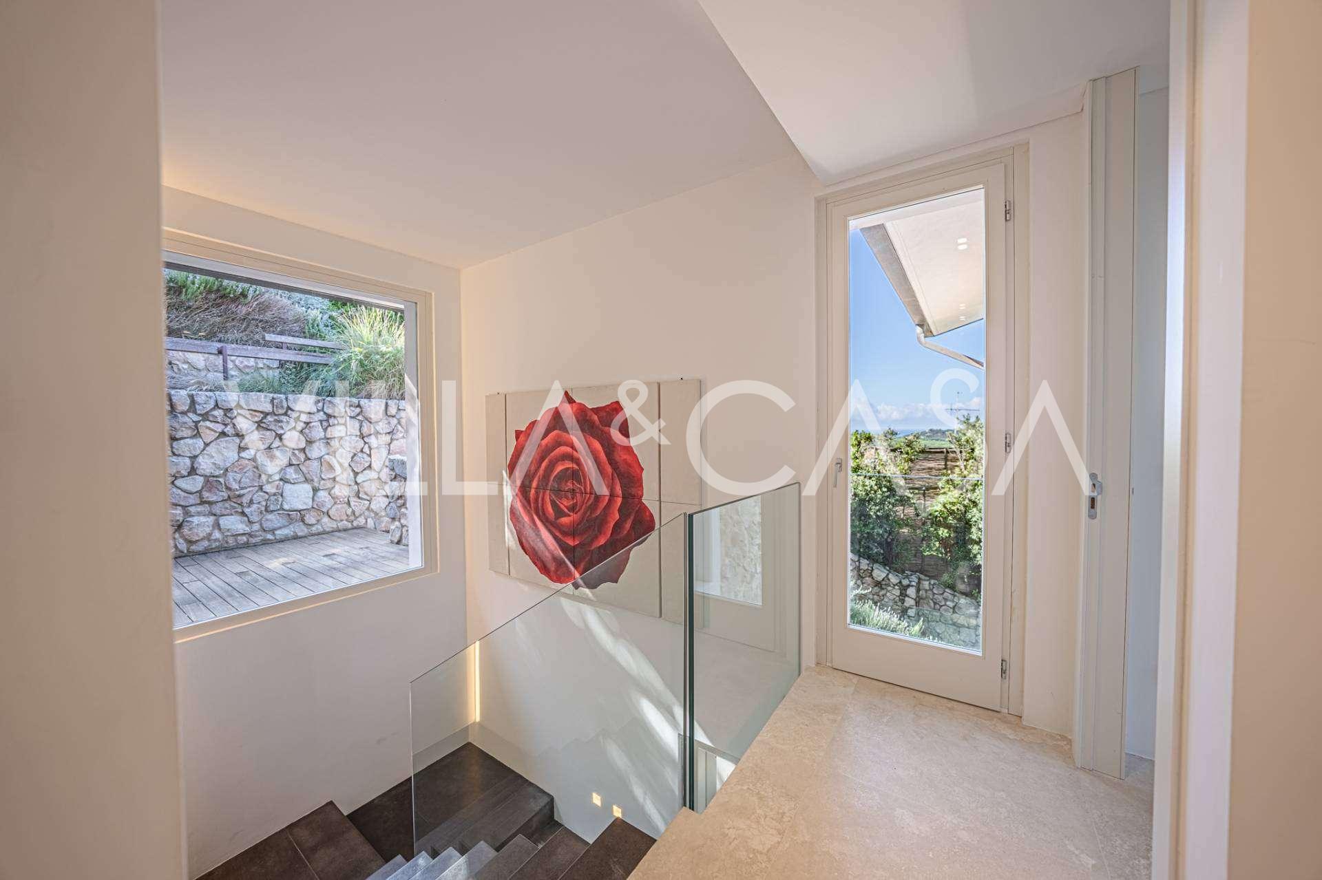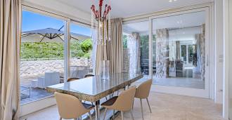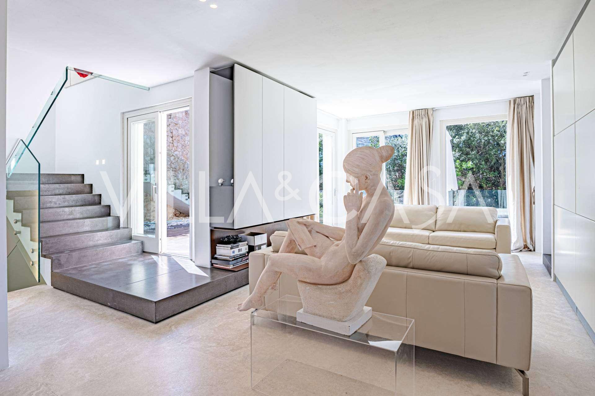Recently fully renovated and spread over four levels connected by an internal elevator, the residence showcases rare elegance and refined functionality. The architecture, with its impeccable lines and glass facades, creates harmony between the interior spaces and charming terraces. The villa is surrounded by a well-maintained terraced garden of 500 m², offering owners privacy and tranquility, where a sophisticated relaxation area with a swimming pool is also hidden.