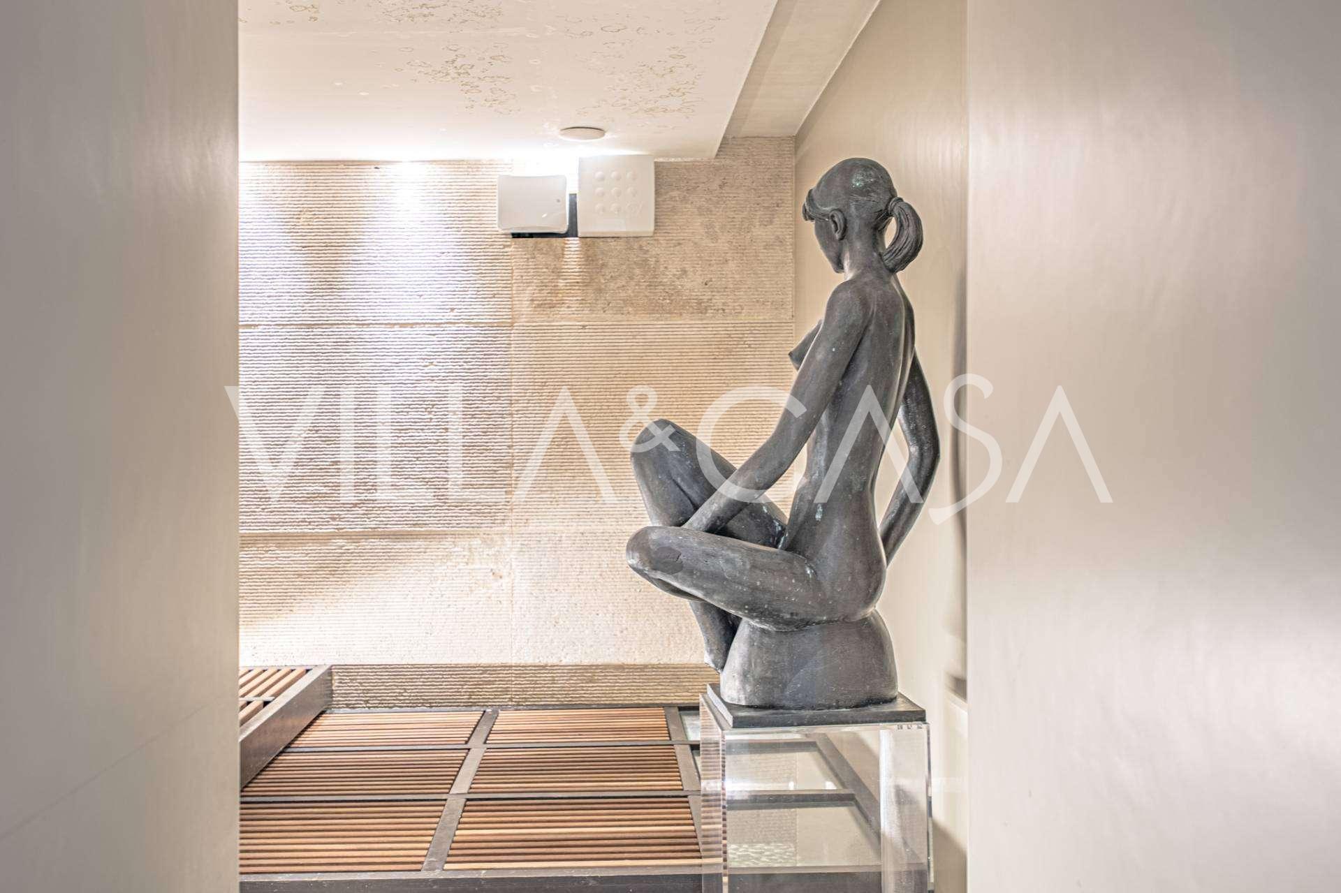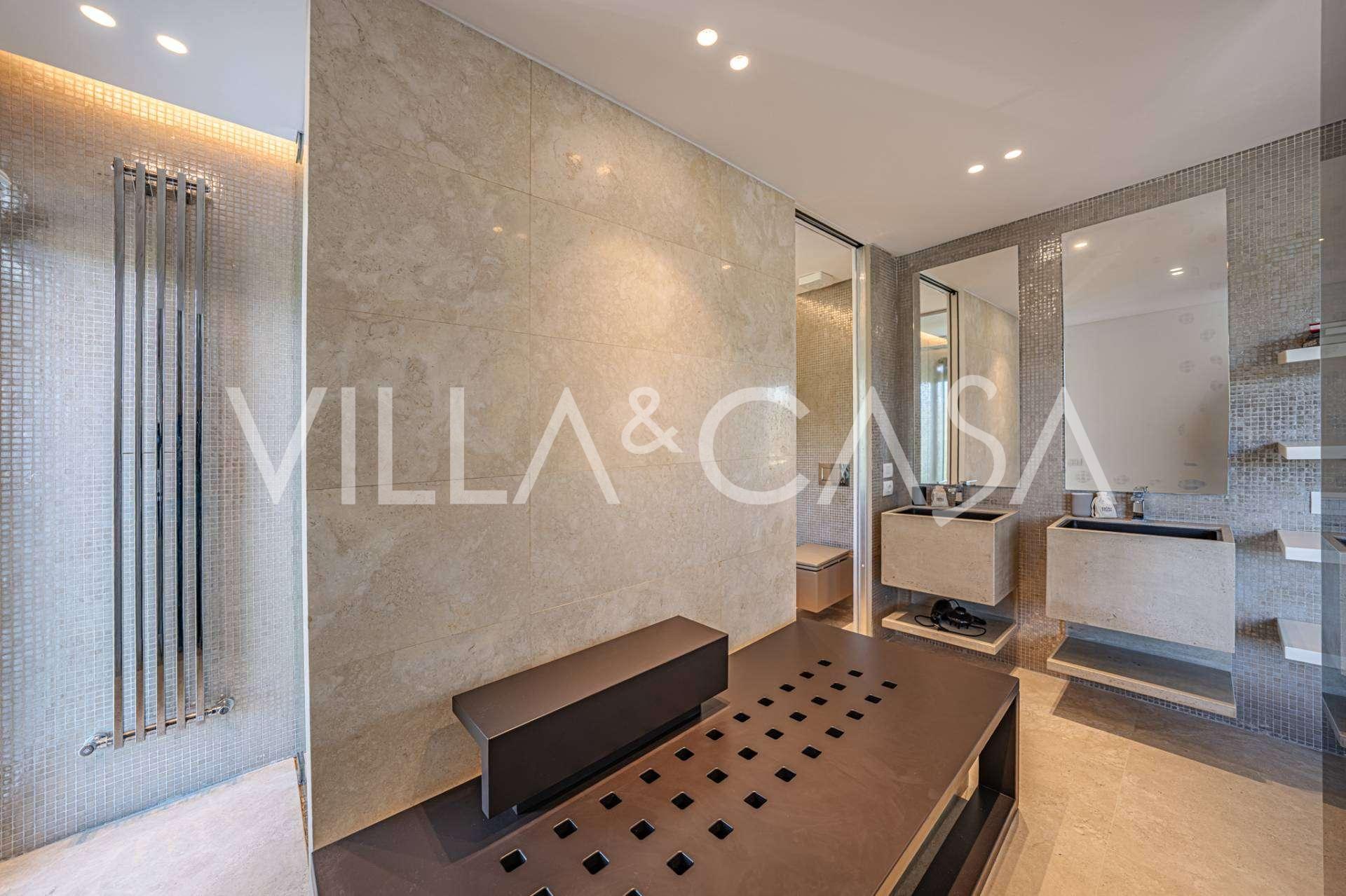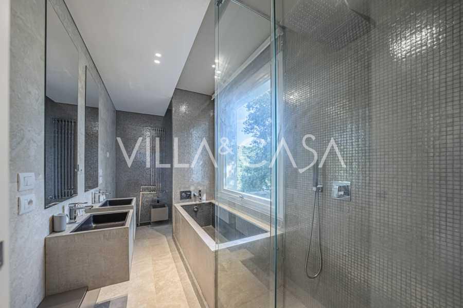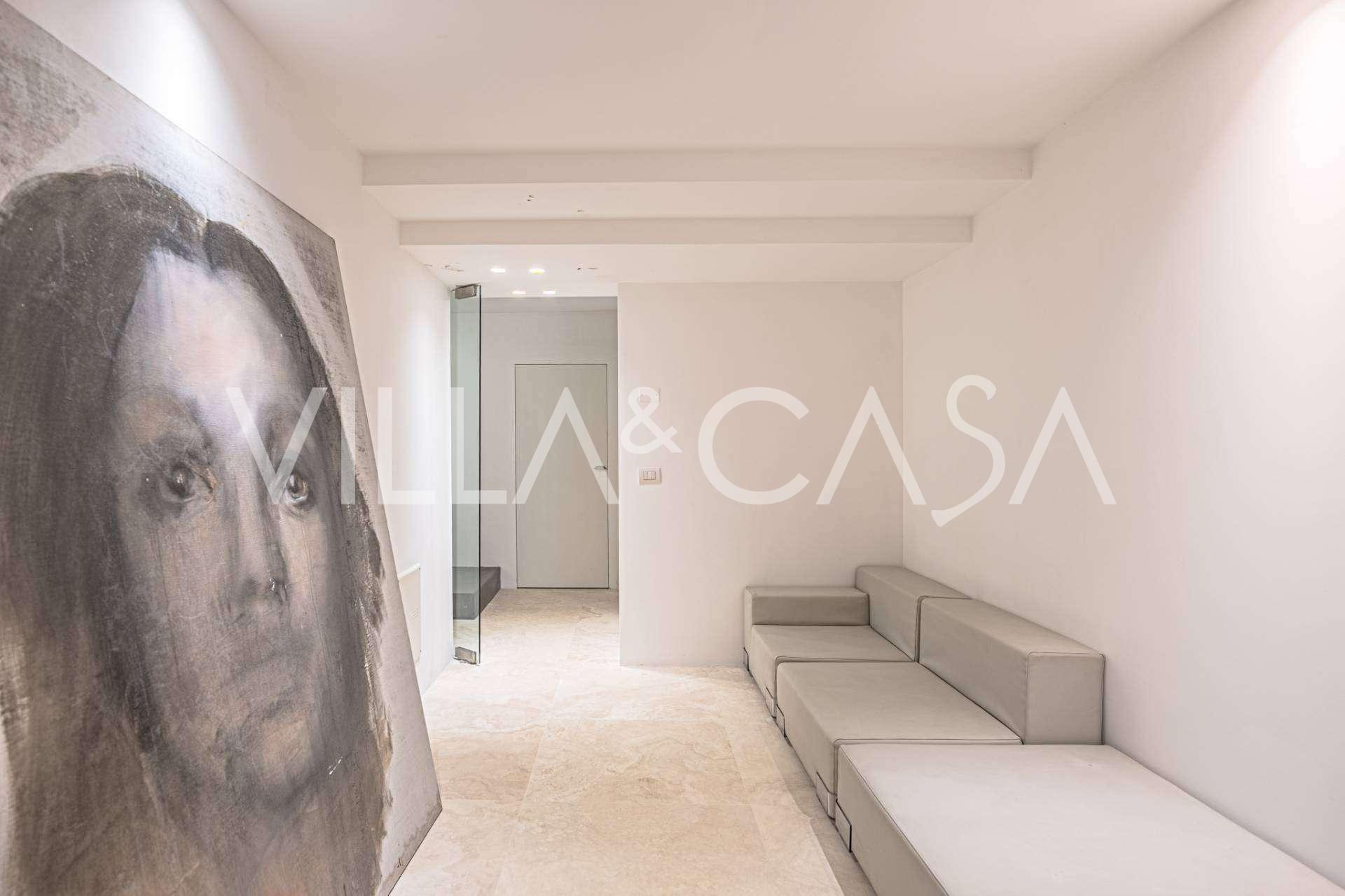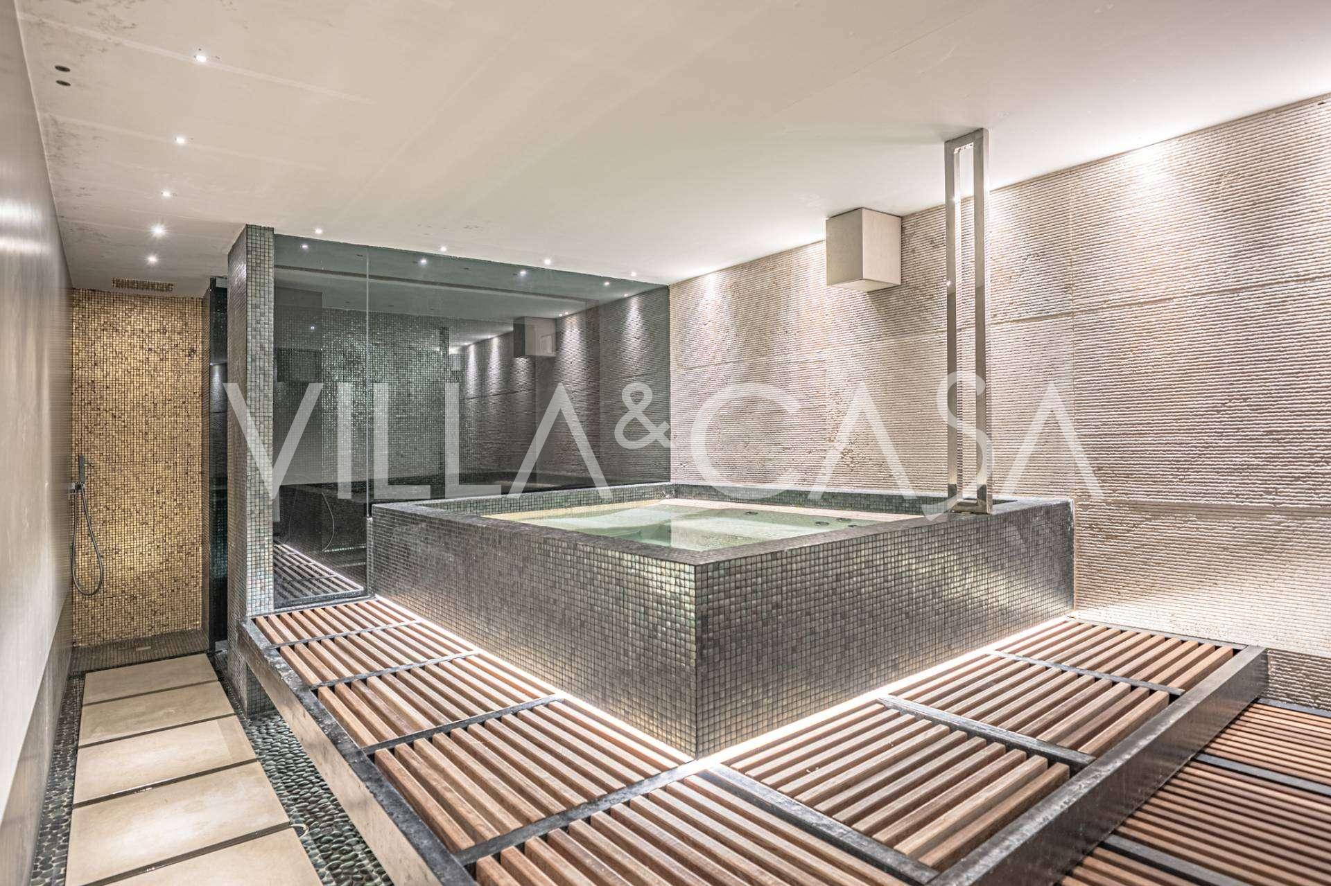 At the garden level, there is a separate apartment with an independent entrance, ideal for guests or staff. In the villa's basement, there is a splendid wellness area: a spacious jacuzzi, Turkish hammam, private relaxation room, as well as an additional bedroom with an en-suite bathroom and storage areas, including a wine cellar.
