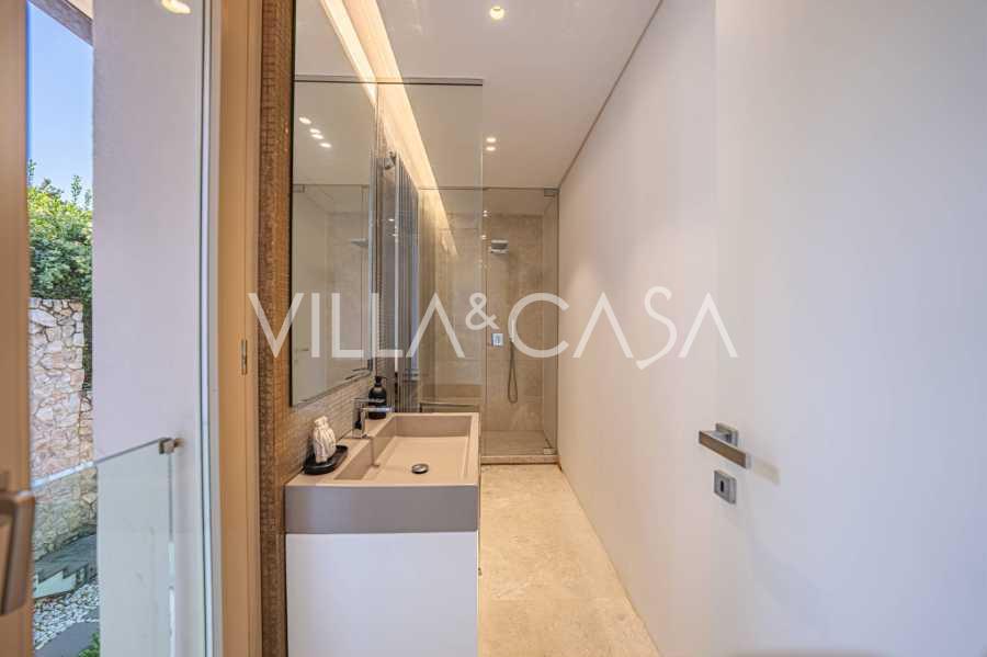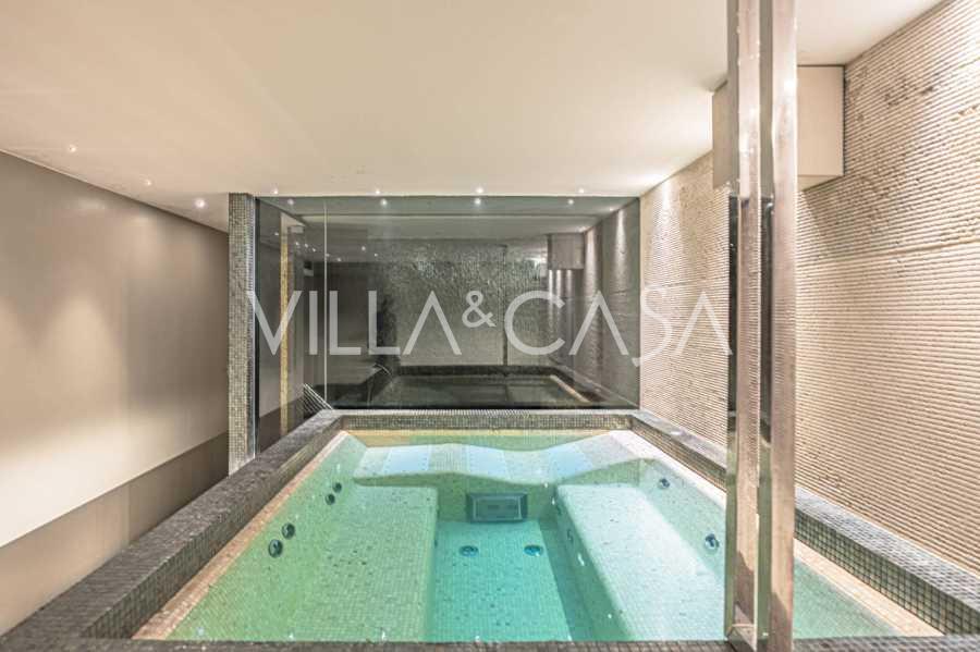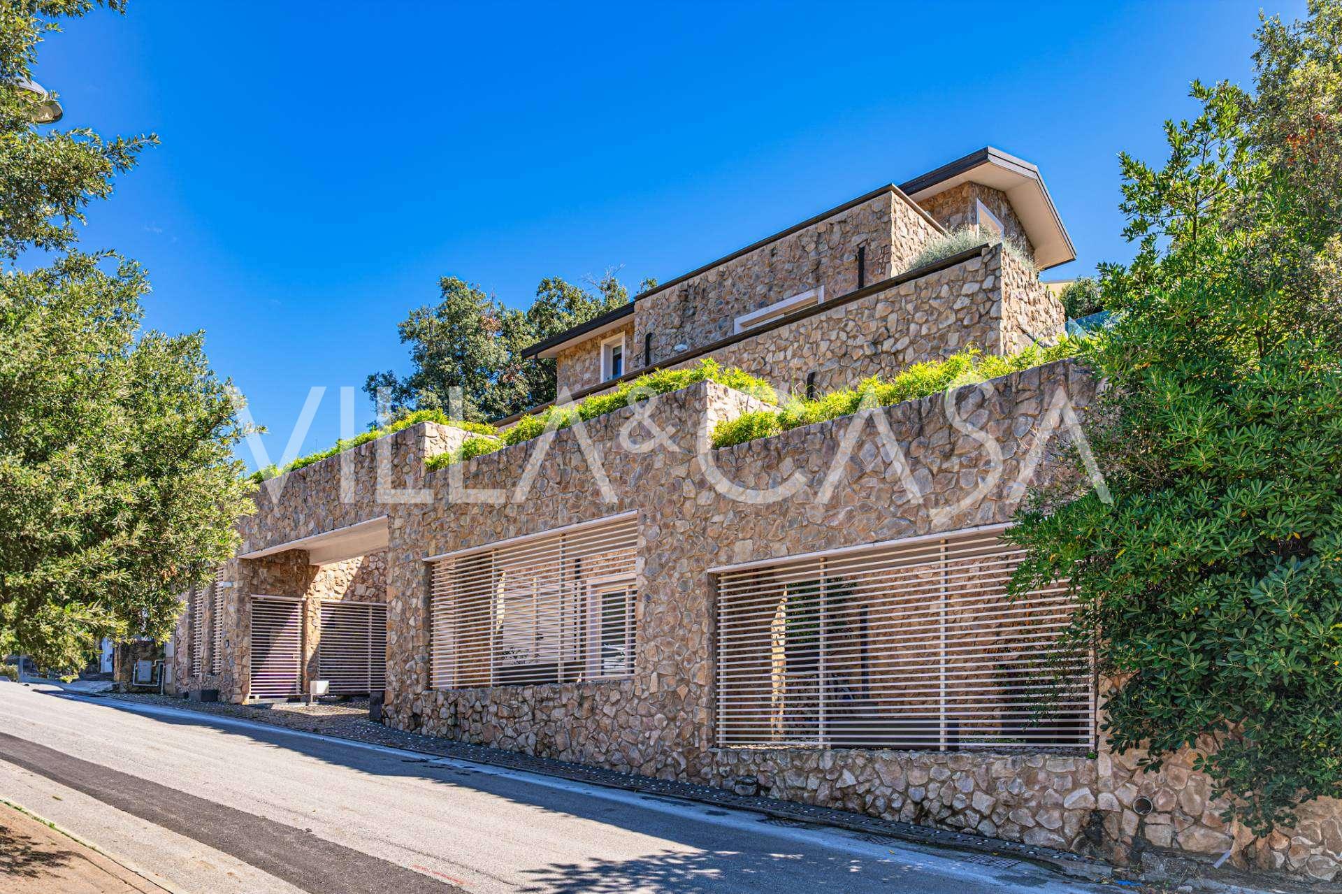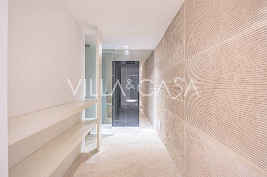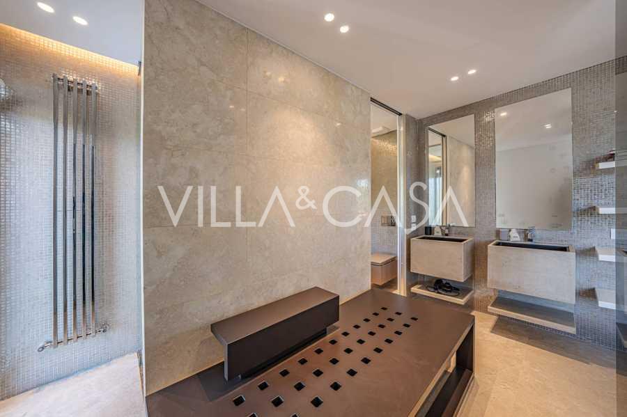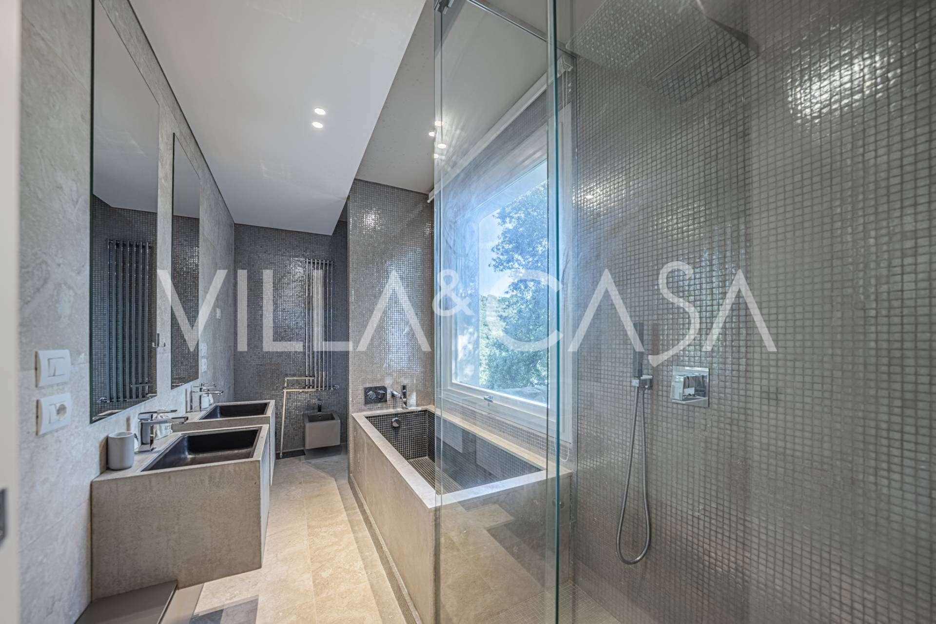 At the garden level, there is a separate apartment with an independent entrance, ideal for guests or staff. In the villa's basement, there is a splendid wellness area: a spacious jacuzzi, Turkish hammam, private relaxation room, as well as an additional bedroom with an en-suite bathroom and storage areas, including a wine cellar.