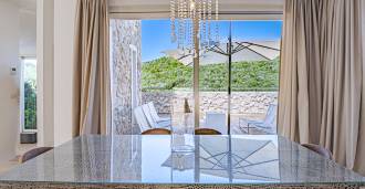 The total internal area is 380 m². On the first floor, there is a magnificent reception area with a spacious living room leading to a large dining terrace overlooking the sea, an exquisite lounge area, and an elegant dining room connected to a fully equipped high-end kitchen.