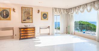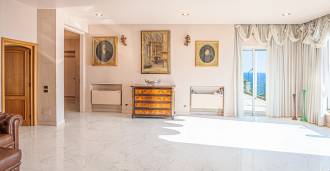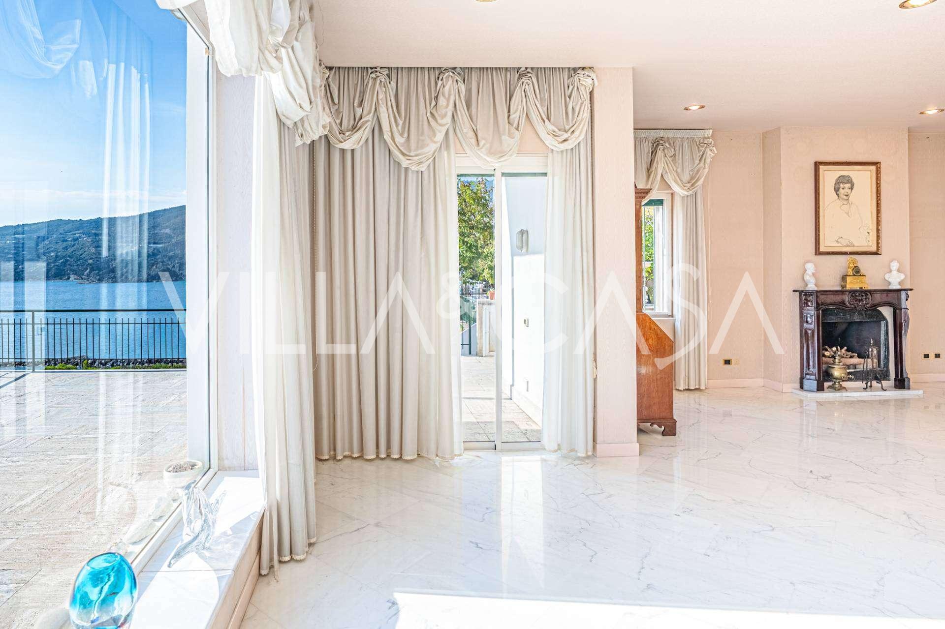 Spacious living room with a marble fireplace and sea view, large terrace with panoramic views, separate dining area, fully equipped kitchen, two elegant bedrooms, two stylish bathrooms, guest toilet, and laundry room.