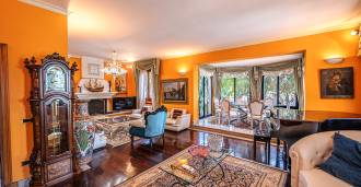 Nearby is a guest house with separate parking for two cars. The house is spread over two floors and includes a living room, kitchen, two bedrooms, and three bathrooms.