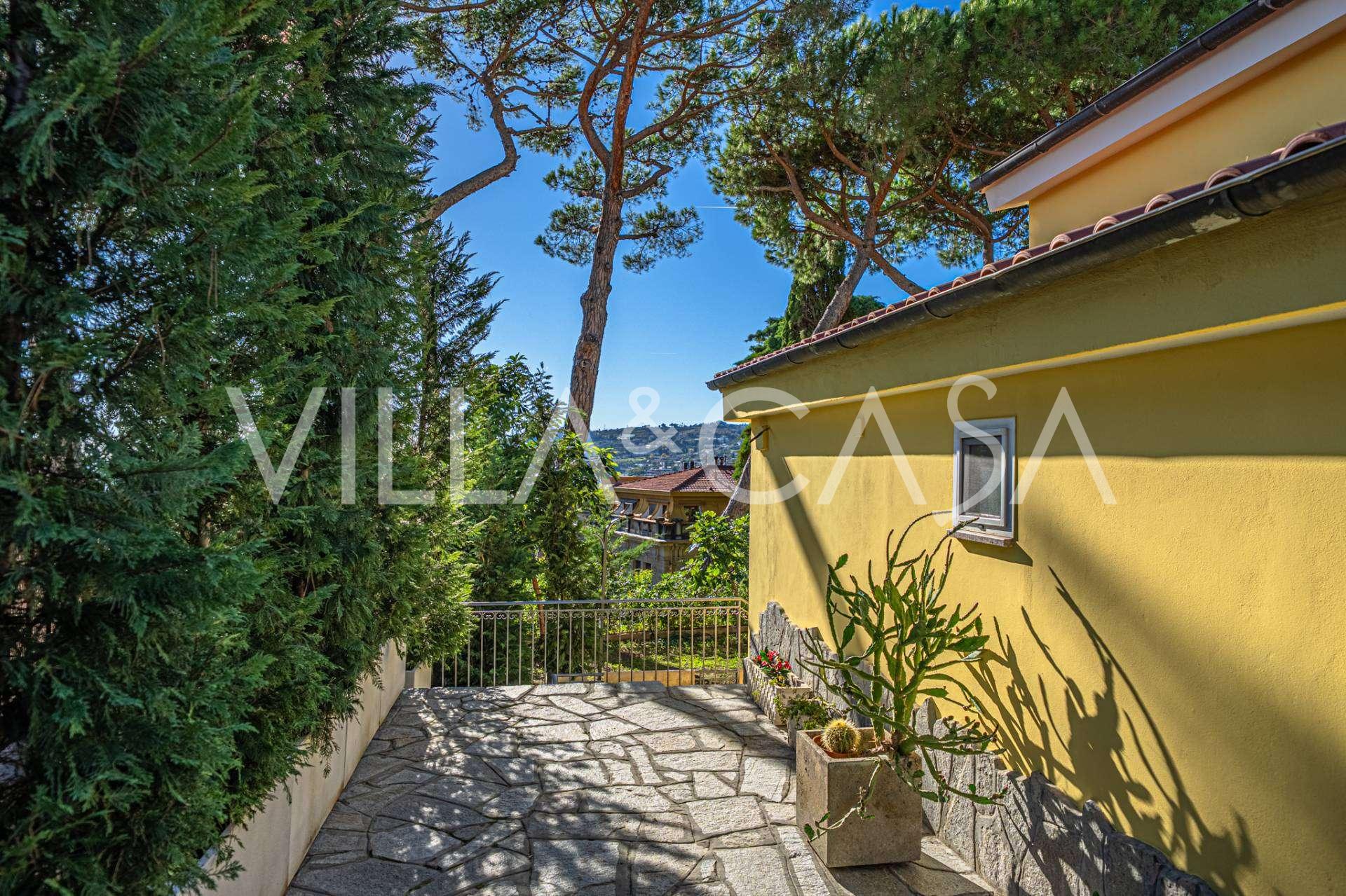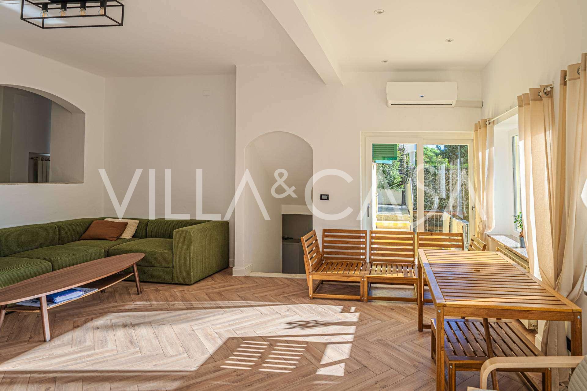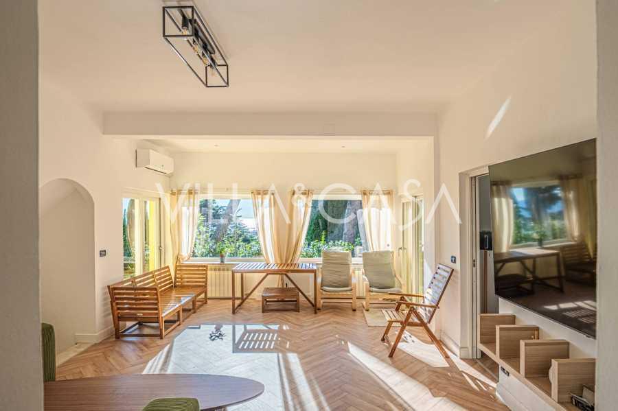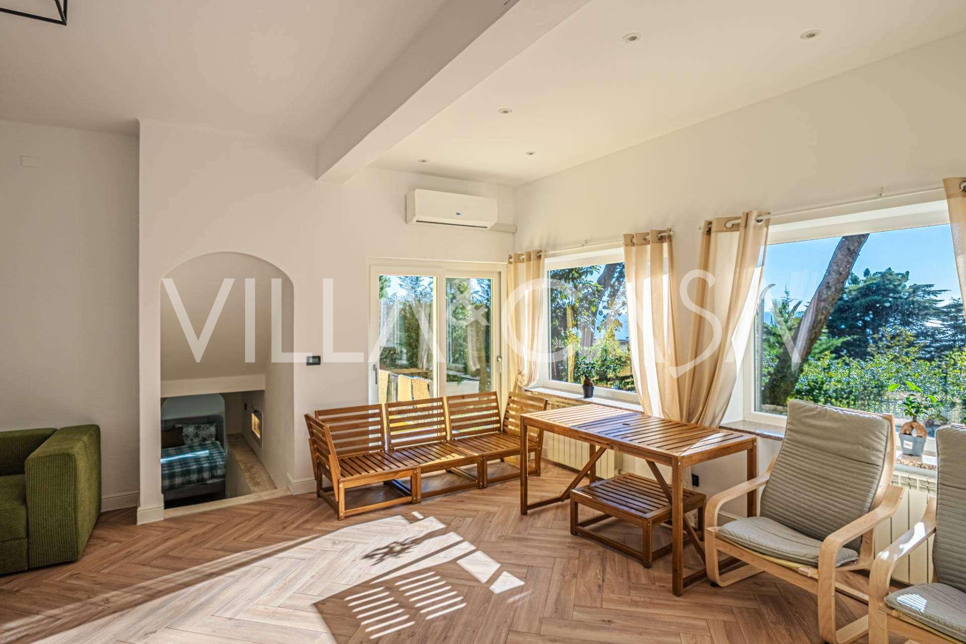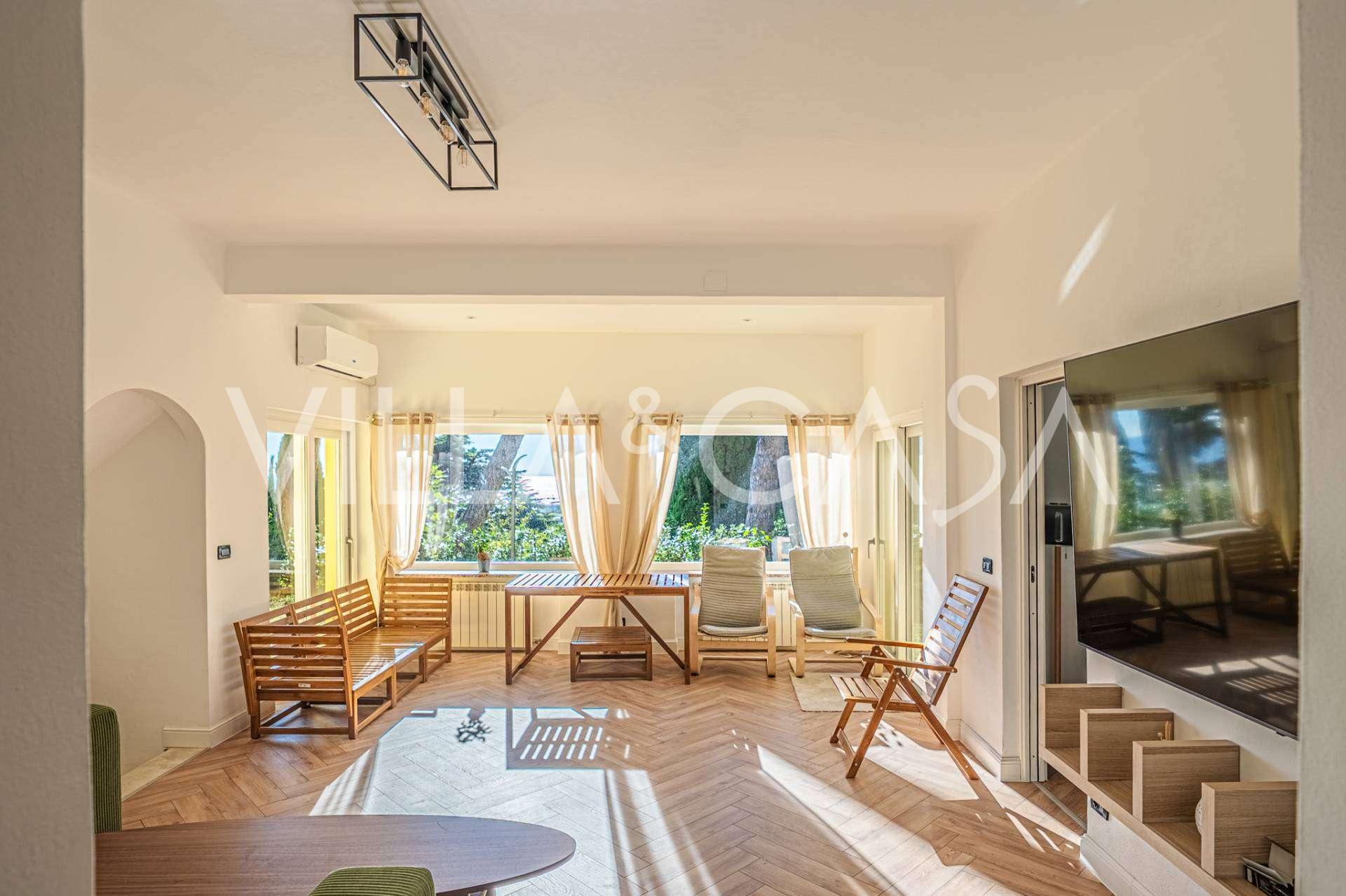 The villa's grounds are lush with greenery: a well-kept garden with decorative plants and flowers, an outdoor relaxation area, and private parking for three cars. A recent renovation has added modernity and freshness to the home while preserving its Mediterranean elegance.