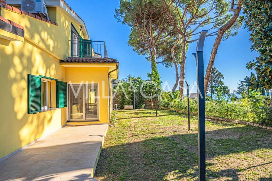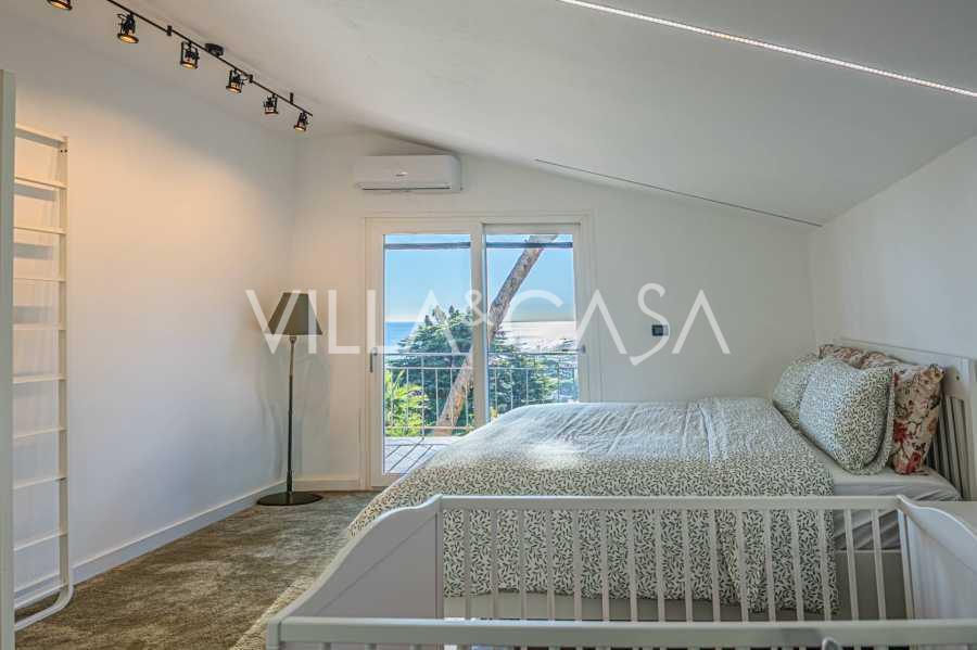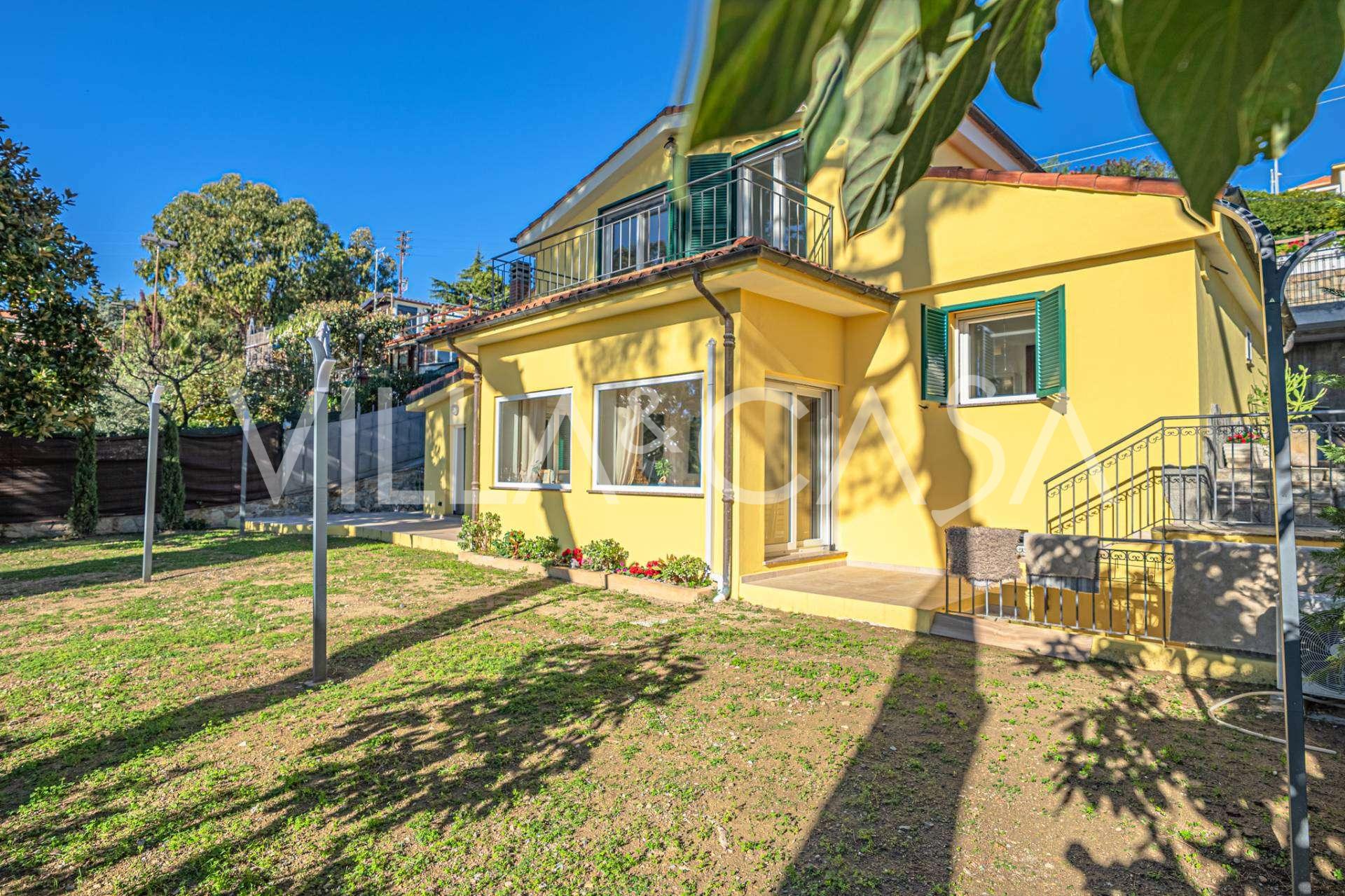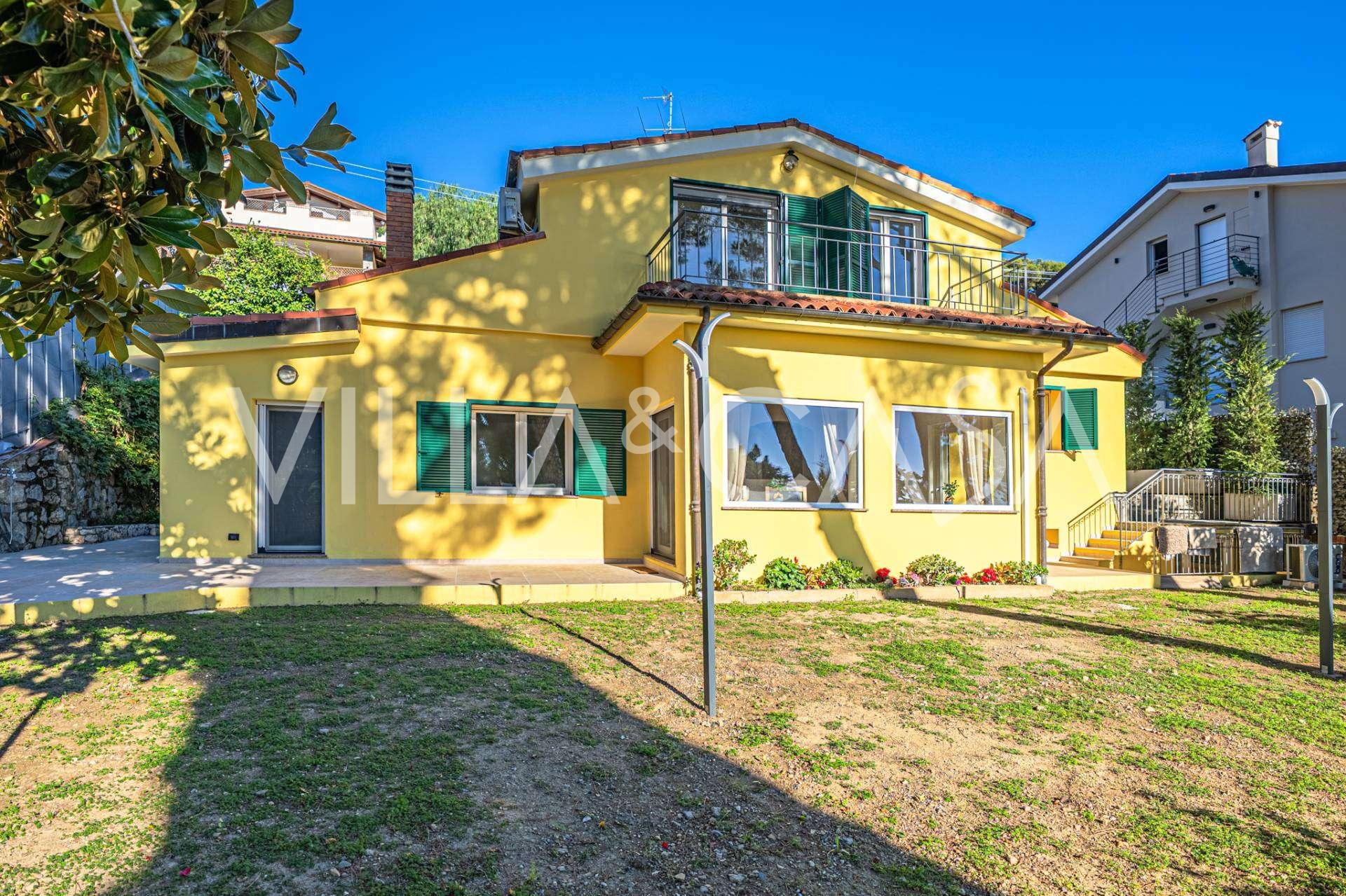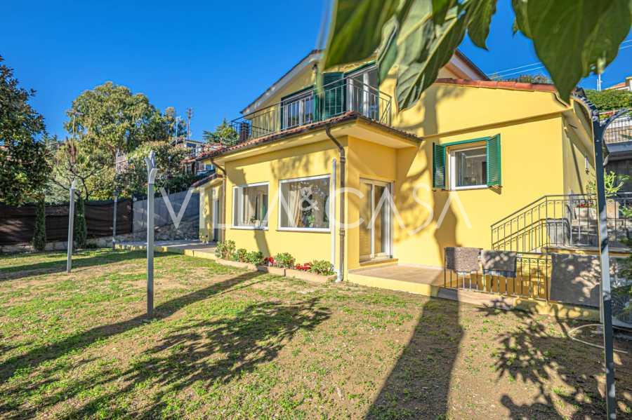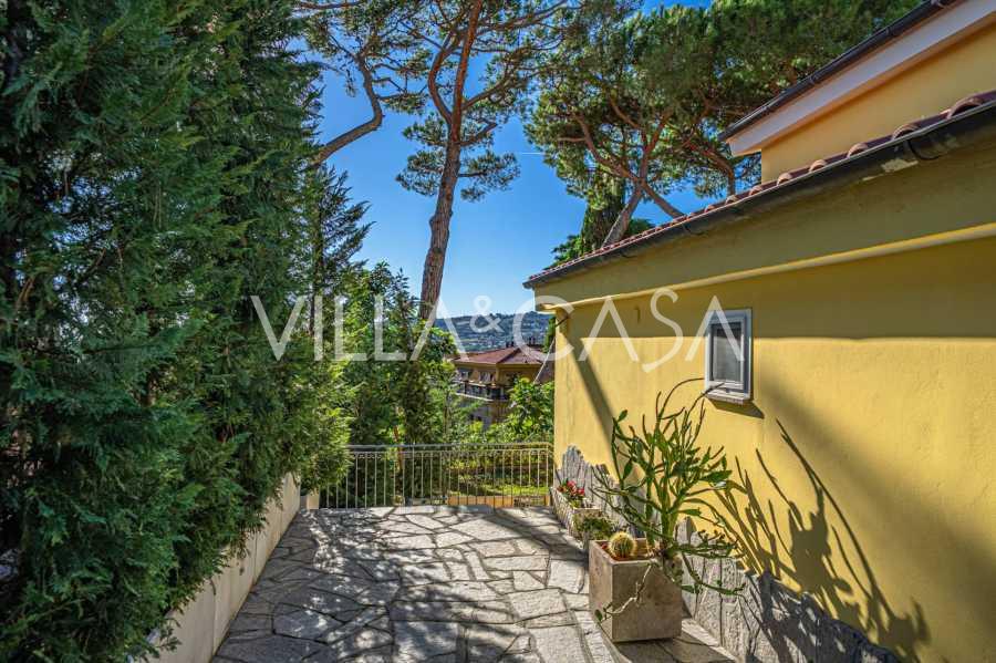The villa's grounds are lush with greenery: a well-kept garden with decorative plants and flowers, an outdoor relaxation area, and private parking for three cars. A recent renovation has added modernity and freshness to the home while preserving its Mediterranean elegance.