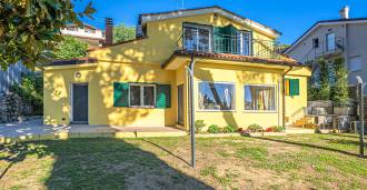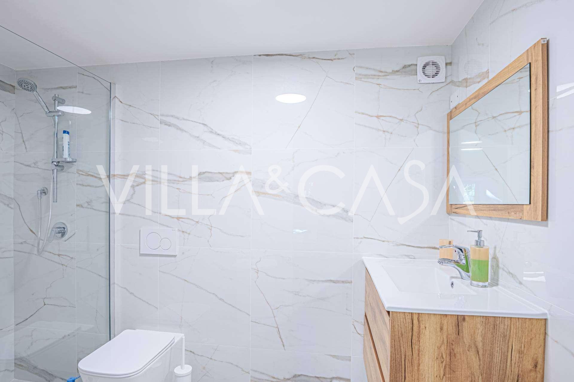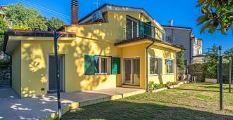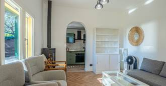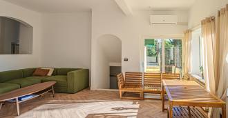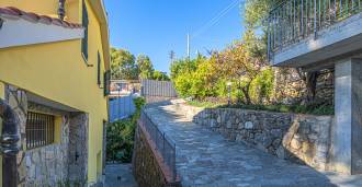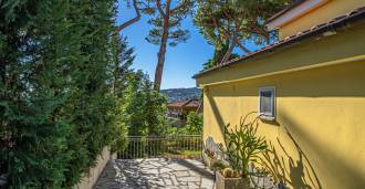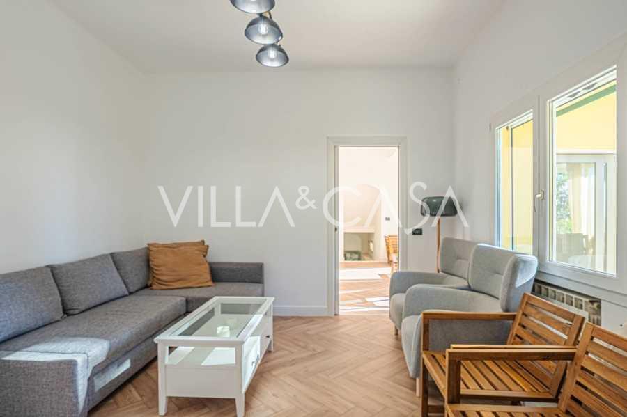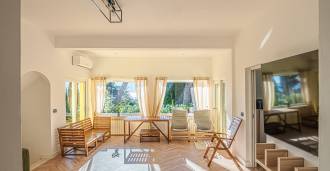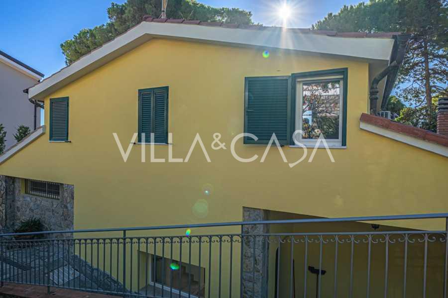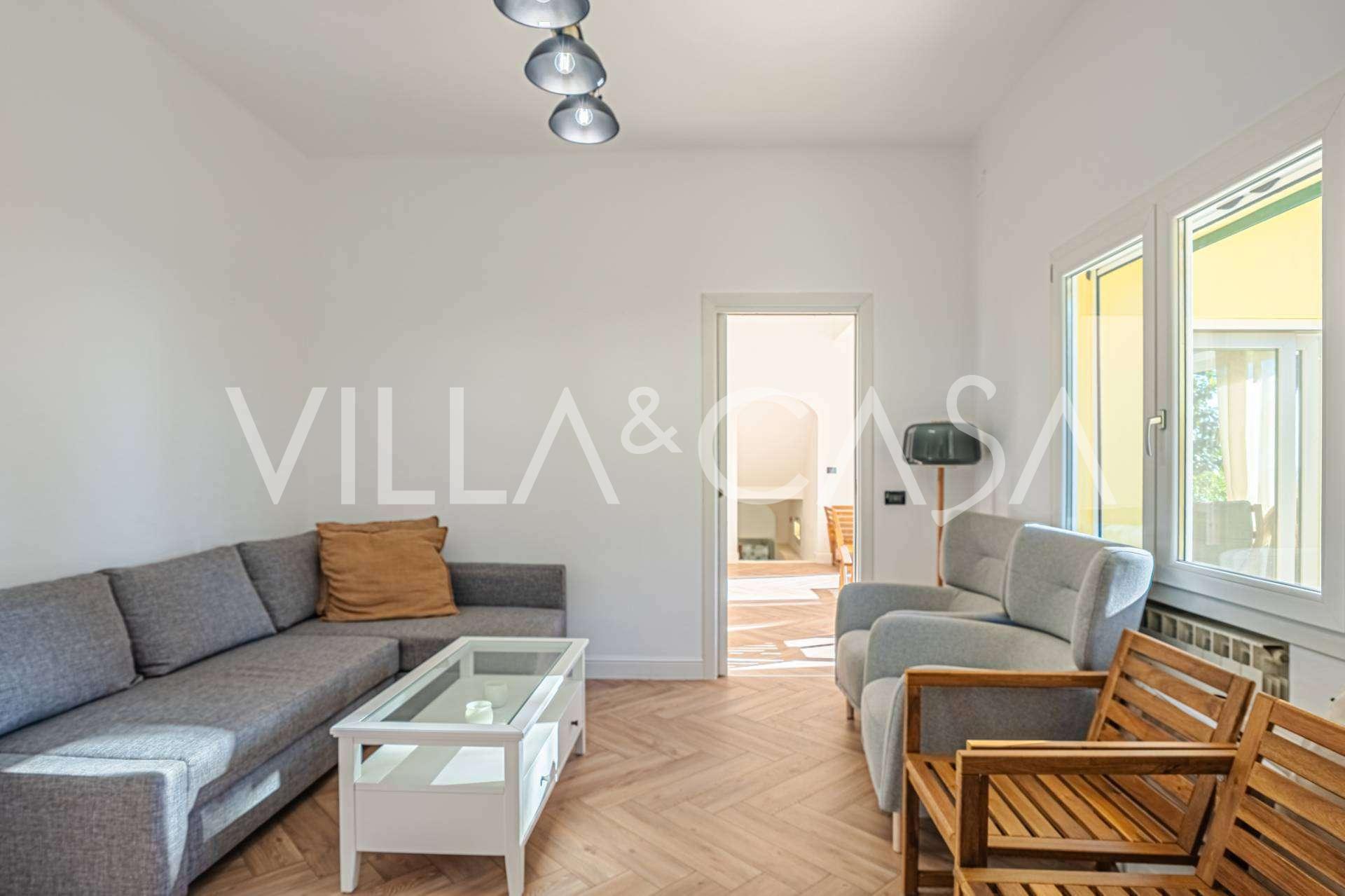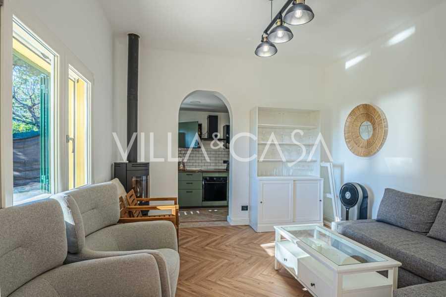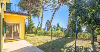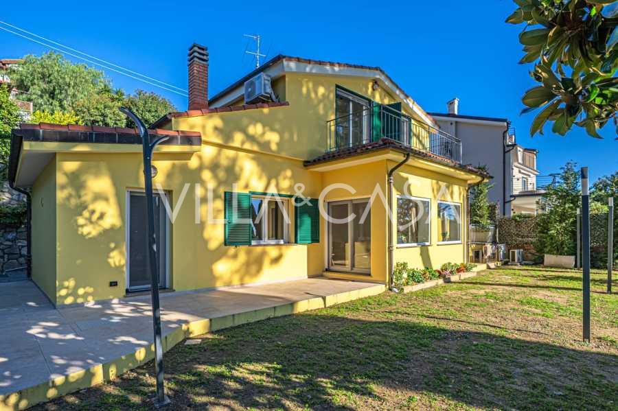 The villa's grounds are lush with greenery: a well-kept garden with decorative plants and flowers, an outdoor relaxation area, and private parking for three cars. A recent renovation has added modernity and freshness to the home while preserving its Mediterranean elegance.