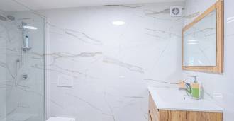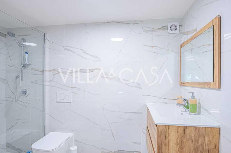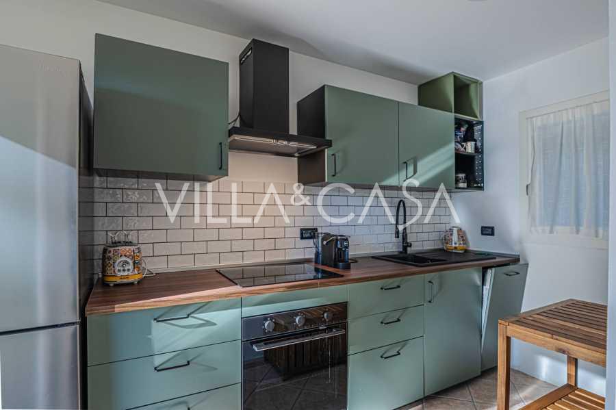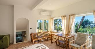 On the main level, guests are greeted by a bright and spacious hall with sea views. The elegant living room, filled with natural light, opens to the garden and terrace, perfect for relaxation and entertaining guests. The separate kitchen is designed in a modern style and is fully equipped. This level also features an elegant bathroom and a charming portico, suitable for outdoor dining with a sea view.