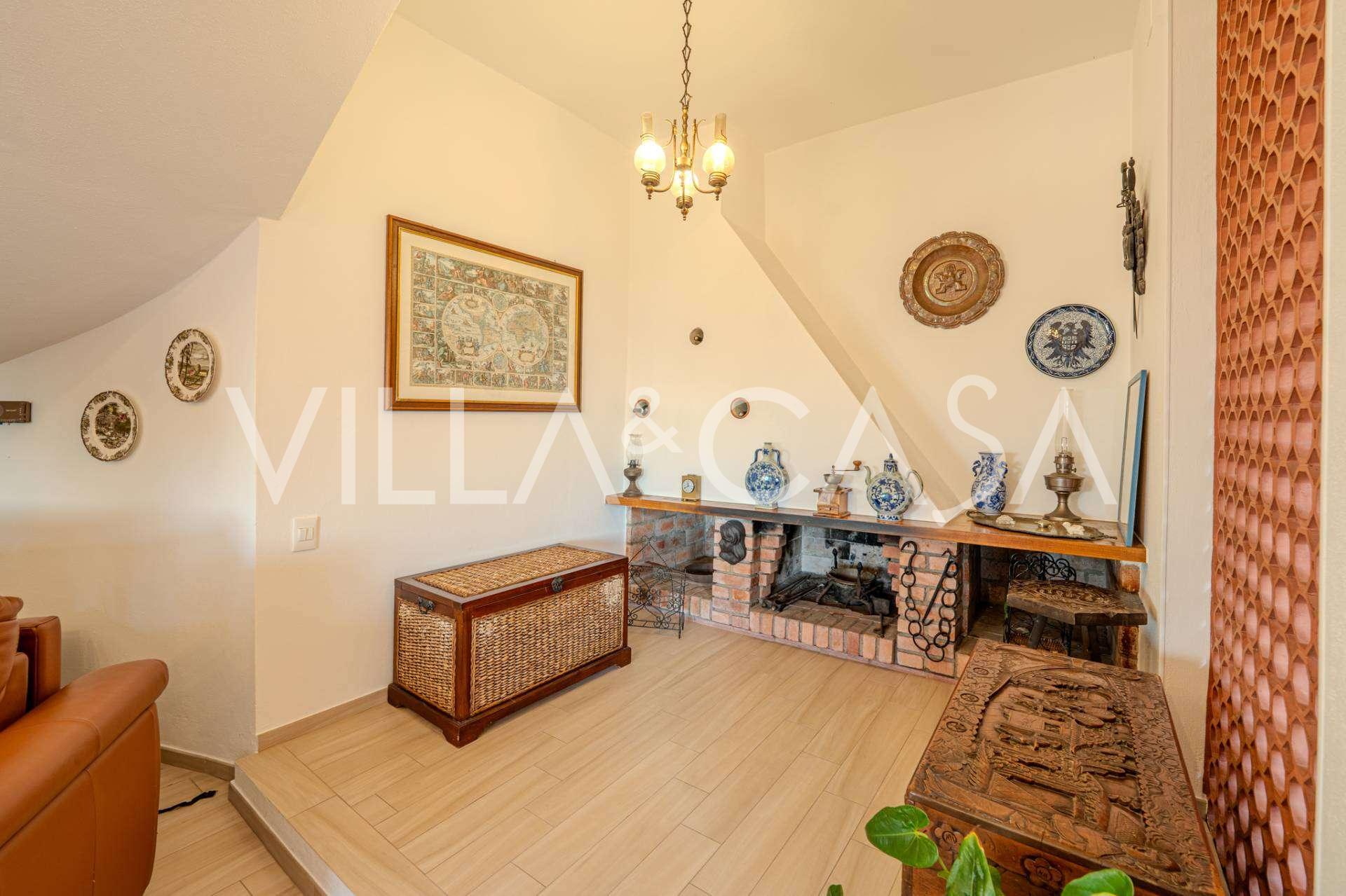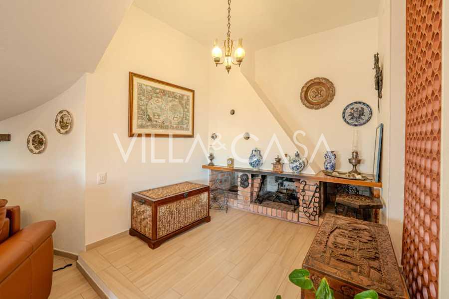 On the second level: a large living room with a fireplace and sea view, with access to the garden and balcony. The kitchen also has a sea view. Bathroom.