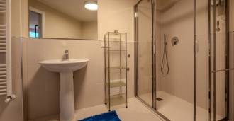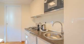On the first level, there is a separate apartment that includes: an entrance hall with a wardrobe, a living room with a kitchen, and a bathroom.